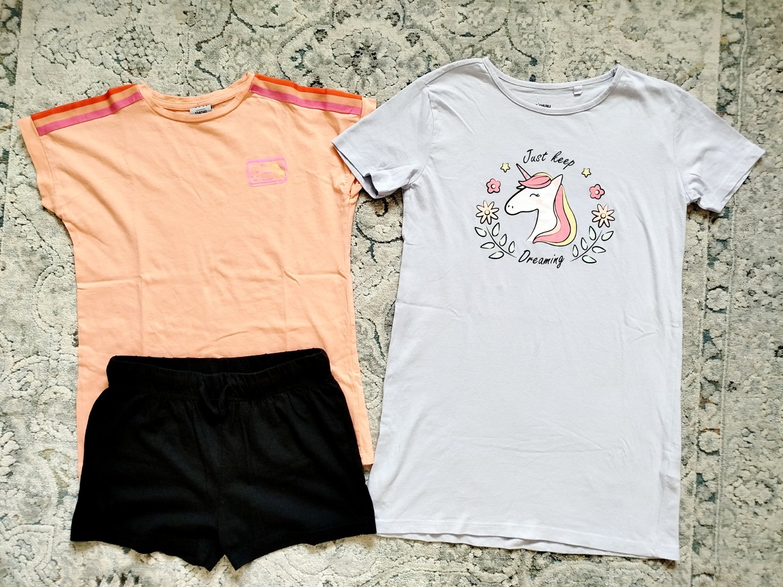 Pekné letné pyžamká, veľkosť 140, top stav. Nočná košeľa má peknú fialkovú farbu, je dlhá 66cm, prsia 39cm, príjemná tenká bavlna, použitá pár krát. Dvojdielne pyžamko má tričko dlhé 55cm, prsia 38cm, bolo použité len 2x. Kraťasy sú nenosené, dĺžka 28cm, pás v kľude 31cm a je na gumu, natiahne sa ak treba. Cena a predaj LEN SPOLU + pošta do 500gr. Balné si neúčtujem 🙂