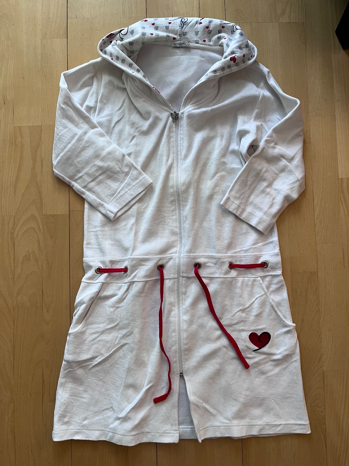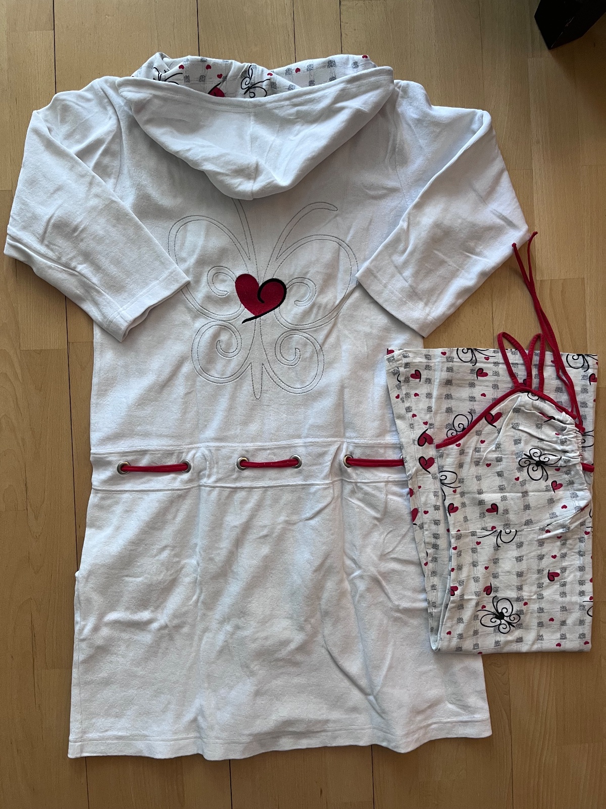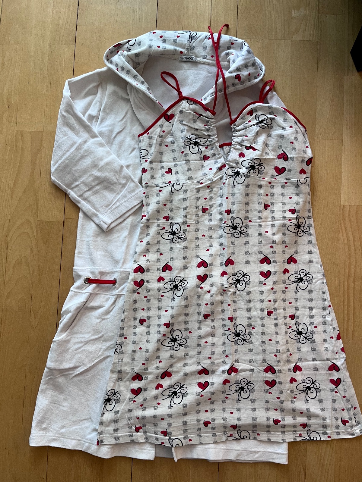 Predam velmi pekny set zupancek a novna kosela. Velkost cca M/L. Zadna dlzka zupancek 97 cm, sirka pod pazuchami 52 cm, rukáv je 3/4, to to bavlnene jemne frote. Nočná kosela dlzka 73 cm, sirka pod pazuchami 42 cm (nenatiahnute), nočná kosela je bavlneny uplet. Set som používala velmi občasne pri babatku - nocna kosela je super na kojenie - ľahko sa odopina. Na predaj len spolu, je to set. BA - Ruzinov.