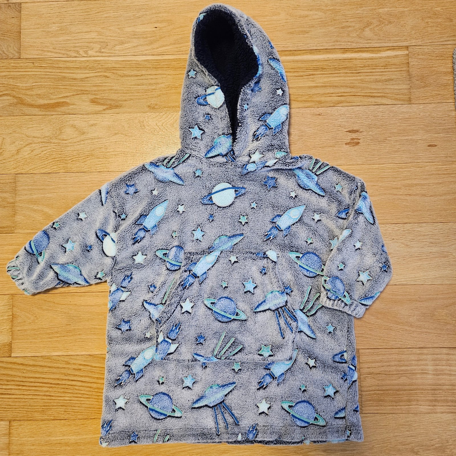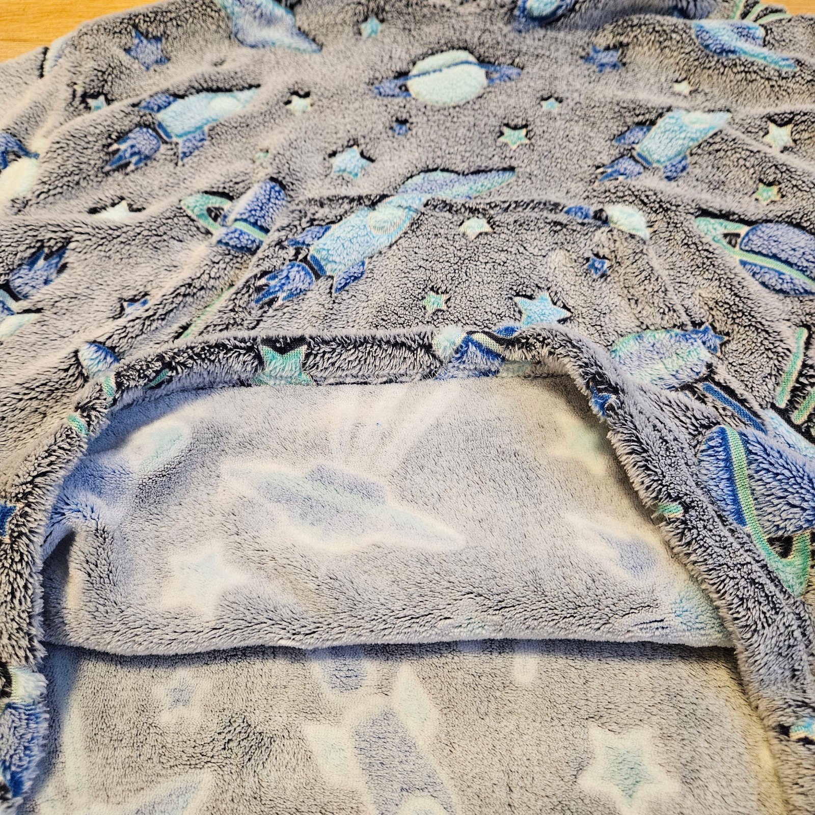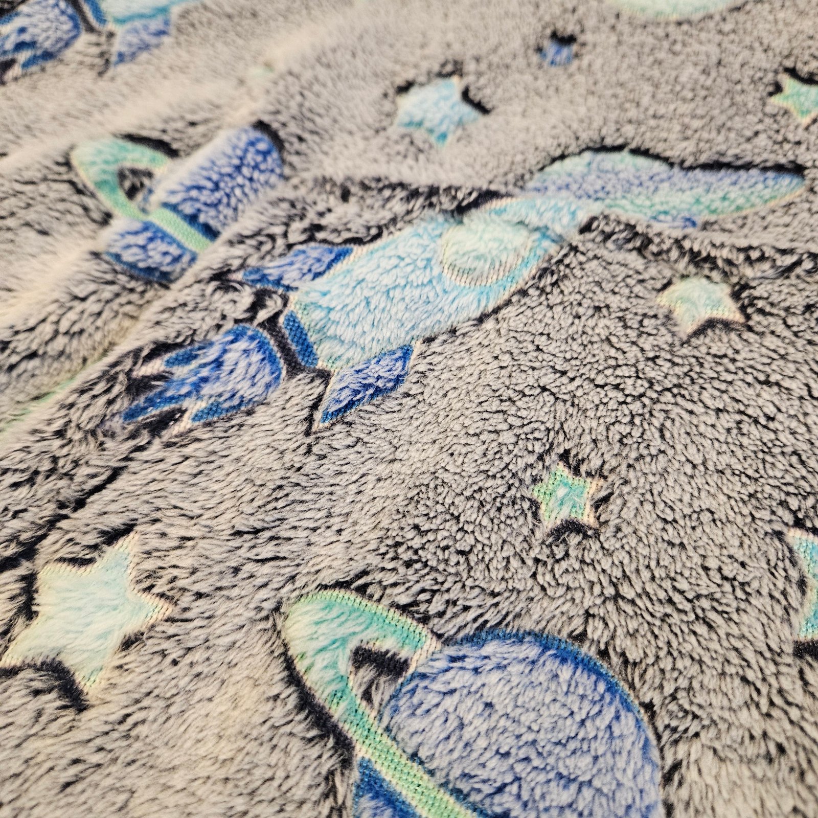 - s motívom vesmíru, modrej farby, v tme planéty svietia, dĺžka 98 - 116 cm (vhodné do 6 rokov)