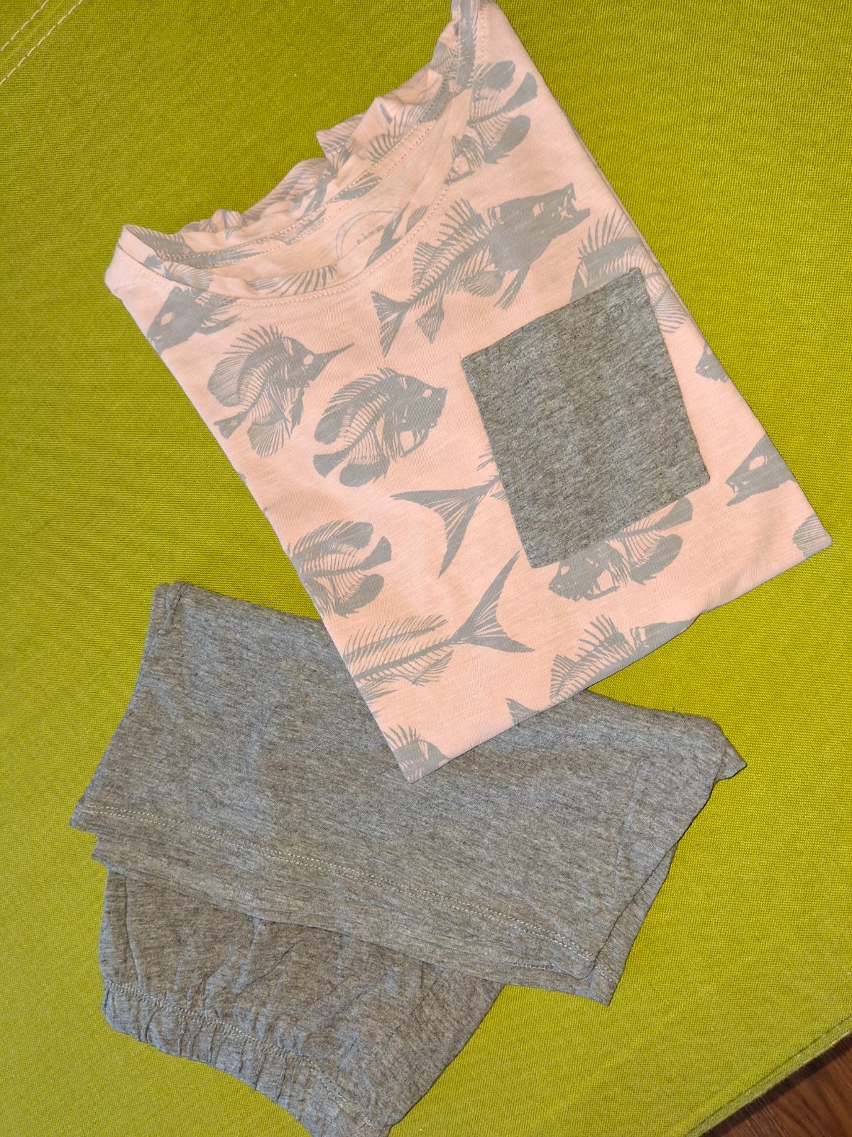 Veľmi pekné, malo nosené pyžamo. Spodný lem sa pára, pozri foto. Šikovná mamina pošije. Ja si netrúfam;)