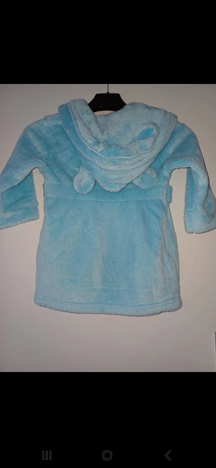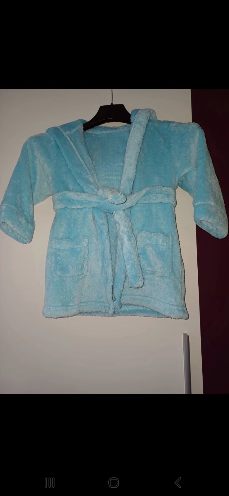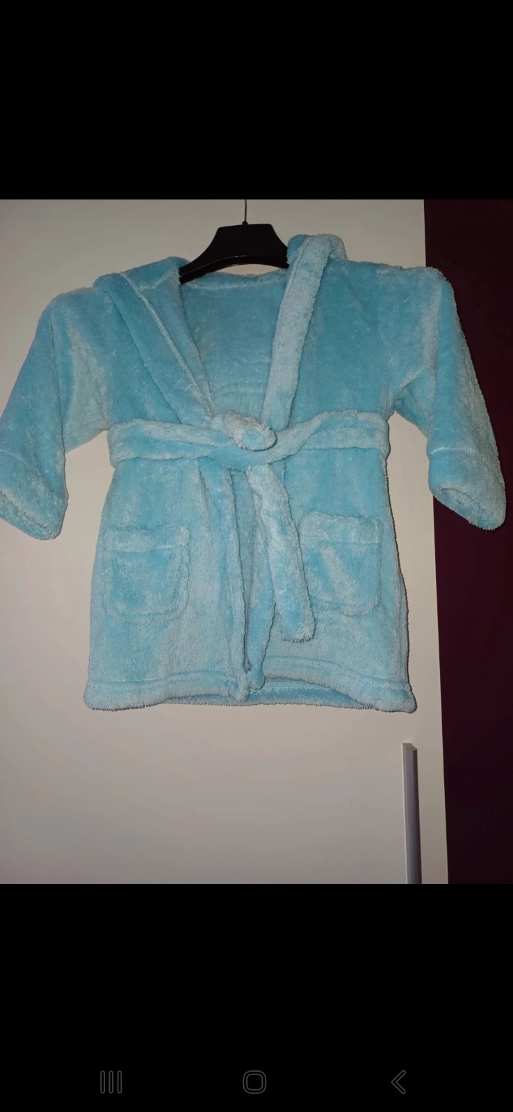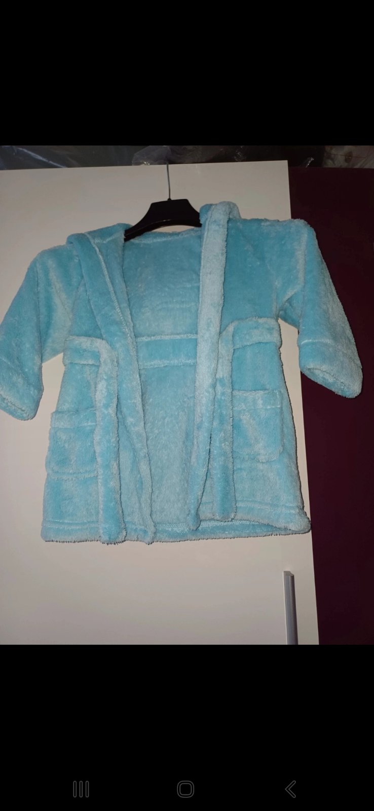 Krásny detský hebký župan tyrkysovej farby s kapucňou s uškami v top stave. Iba opratý .Veľkosť 18-24m.