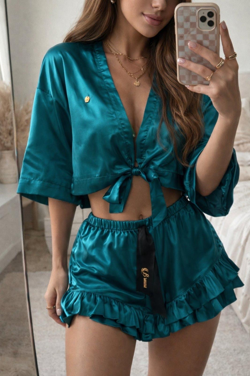Predám tento krásny luxusný saténový pyžamový komplet slovenskej značky BRUUU. Pôvodná cena je 85 EUR. Komplet pozostáva zo šortiek, ktoré veľkostne sedia na XS a S a kimona, ktorý je univerzálnej veľkosti, nakoľko je na viazanie. Set má nádhernú smaragdovú farbu, ktorá sa dala ťažko zachytiť, v skutočnosti je oveľa krajšia. Kimono sa dá nosiť aj ako vršok napríklad na braletky, topy, tričká. Nádherný luxusný kúsok. Oblečený bol len 1-2x.