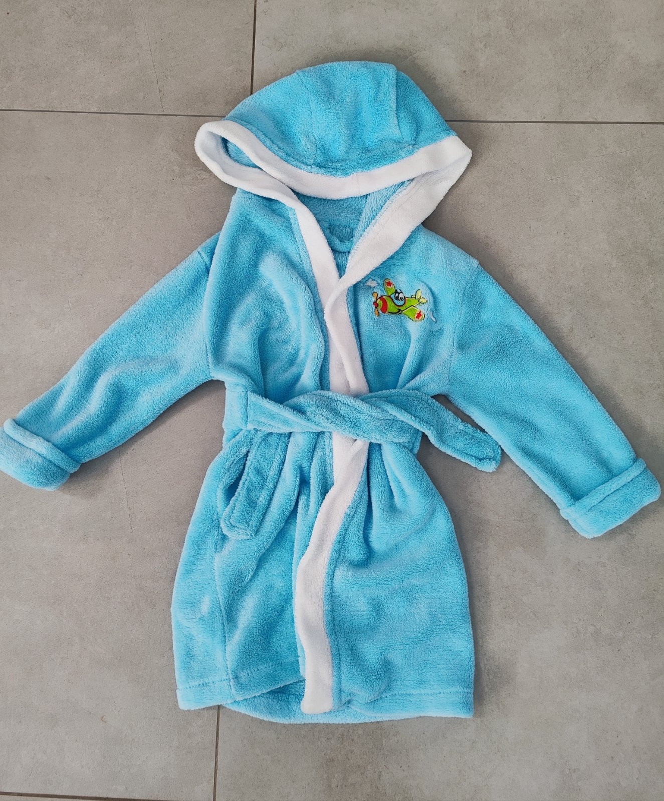 Krásny župan so žralokmi a plutvou na hlave. Je super, stále v dobrom stave, akurát trošku vidno pranie a opasok sa na konci trošku strapká. Je to jemné froté.