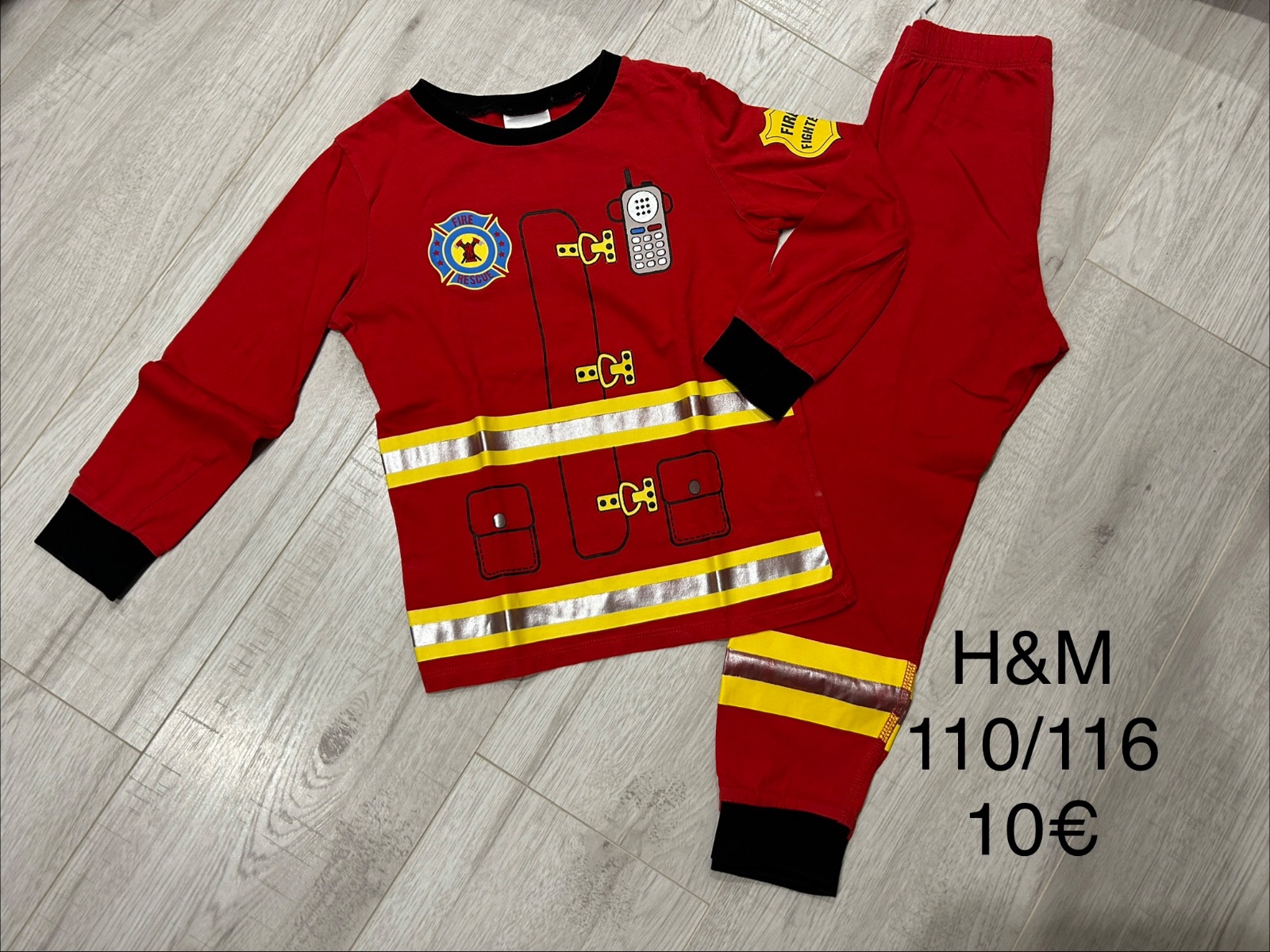 Pyžamo H&M veľkosť 4-6rokov,110-116,vrch tričkovina,spodok flanel,zašitá dierka nad vreckom,nazehlene meno.