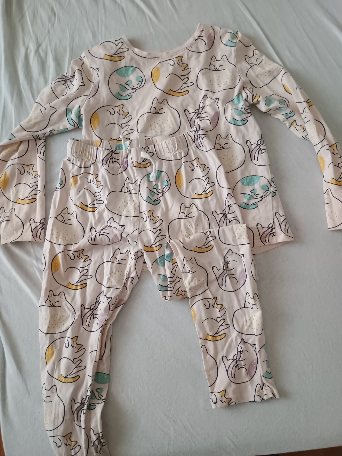 Pyžamo s mačkami,bez akýchkoľvek poškodení,dole sú rovné nohavice,nie manžety.