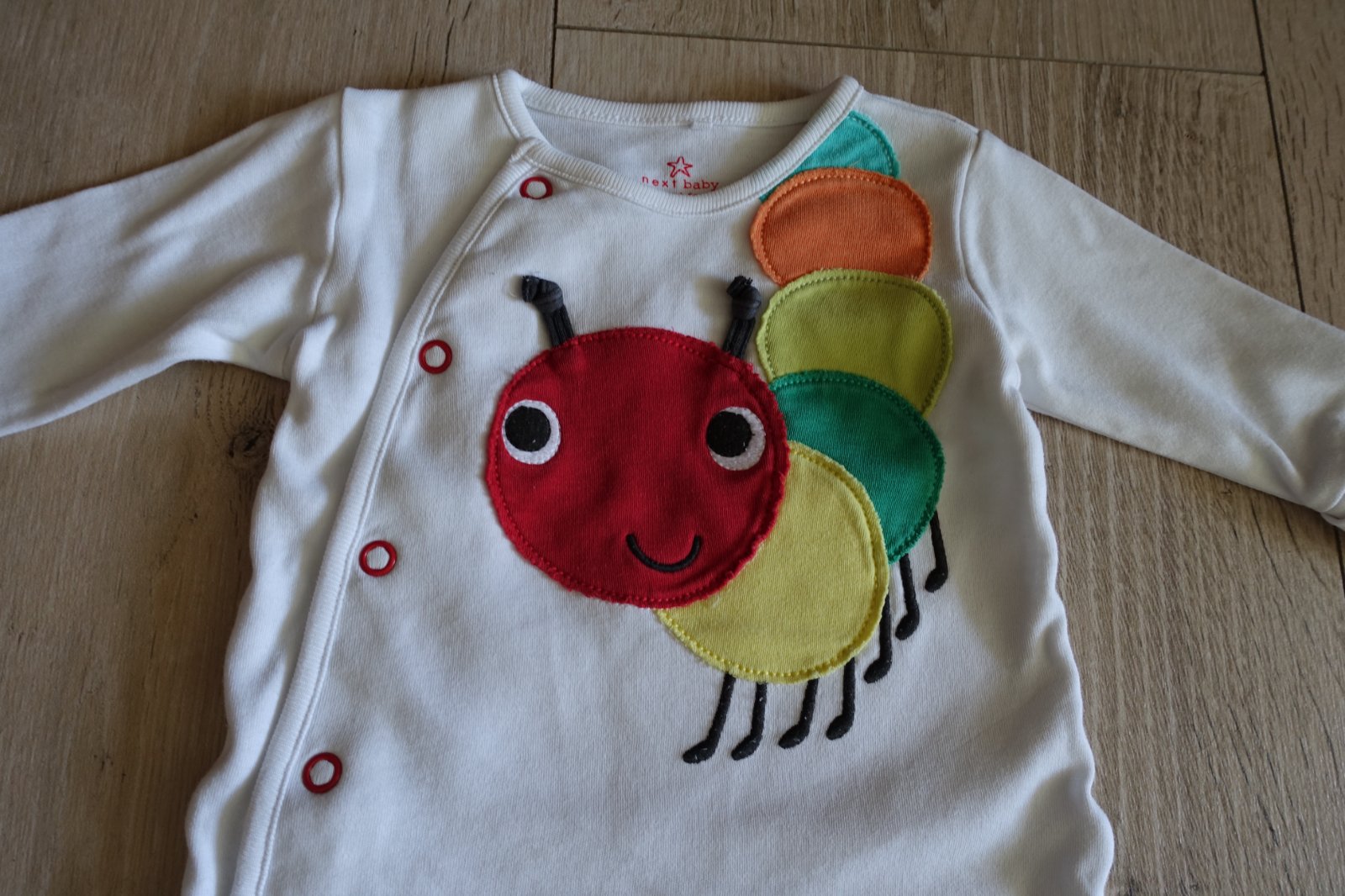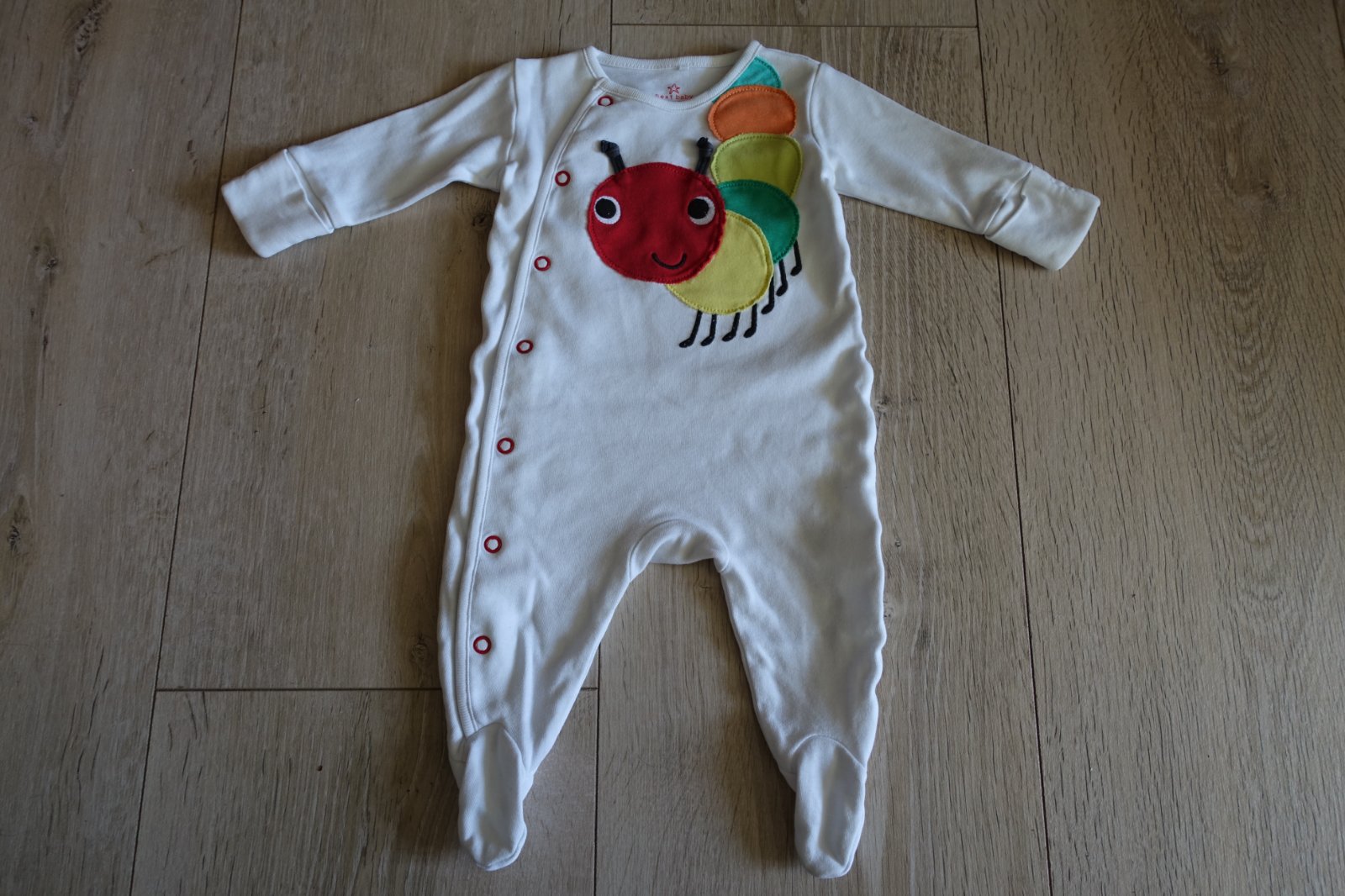 Predám bavlnený overalík s húseničkou vo veľkosti 56. Štítok som žiaľ odstrihla, riaďte sa prosím rozmermi. Nám sedel v tejto veľkosti. Overalík bol pár krát nosený, ale je v peknom nosenom stave. Trolilinka sa už začína robiť chĺpoček z prania pri naklonení, ale nie je žmolkavý. Vidno chĺpoček iba pri naklonení. Ponosiť sa určite ešte dá. Je mäkký a príjemný na nosenie. Konce ručičiek sa dajú zahnúť a spravia sa z nich rukavičky. Dĺžka od pliecka po pätu je 45 cm a od pliecka po rozkrok 32 cm. Je veľmi milučký. Ak len na doma na spinkanie radosť určite ešte urobí. (B)