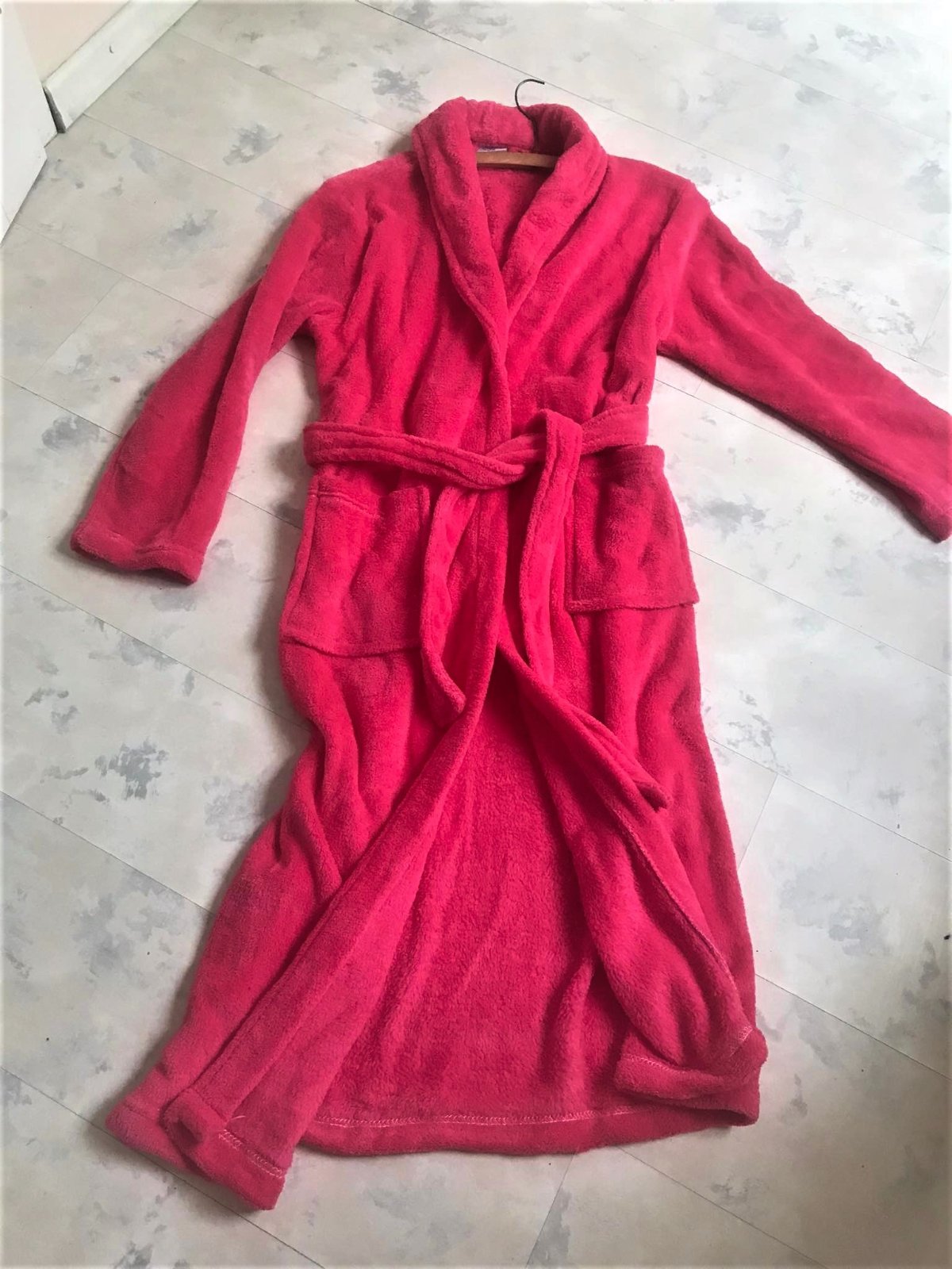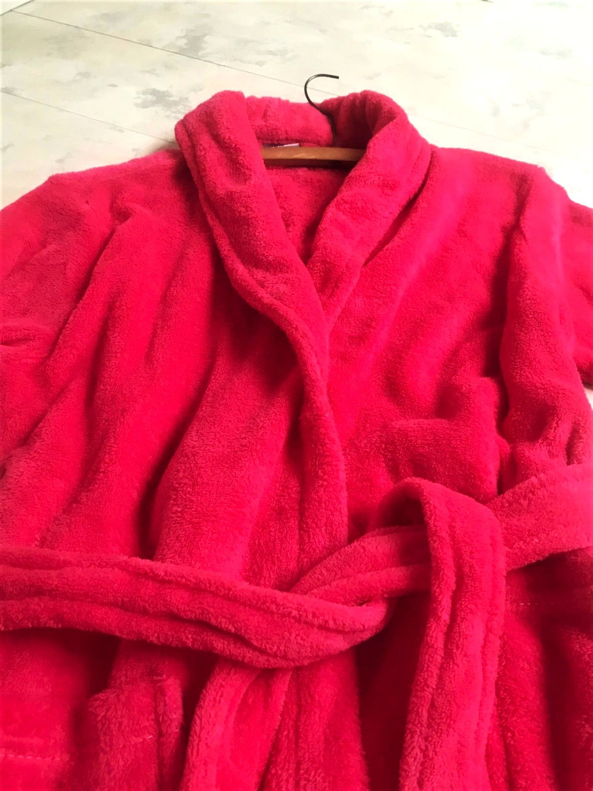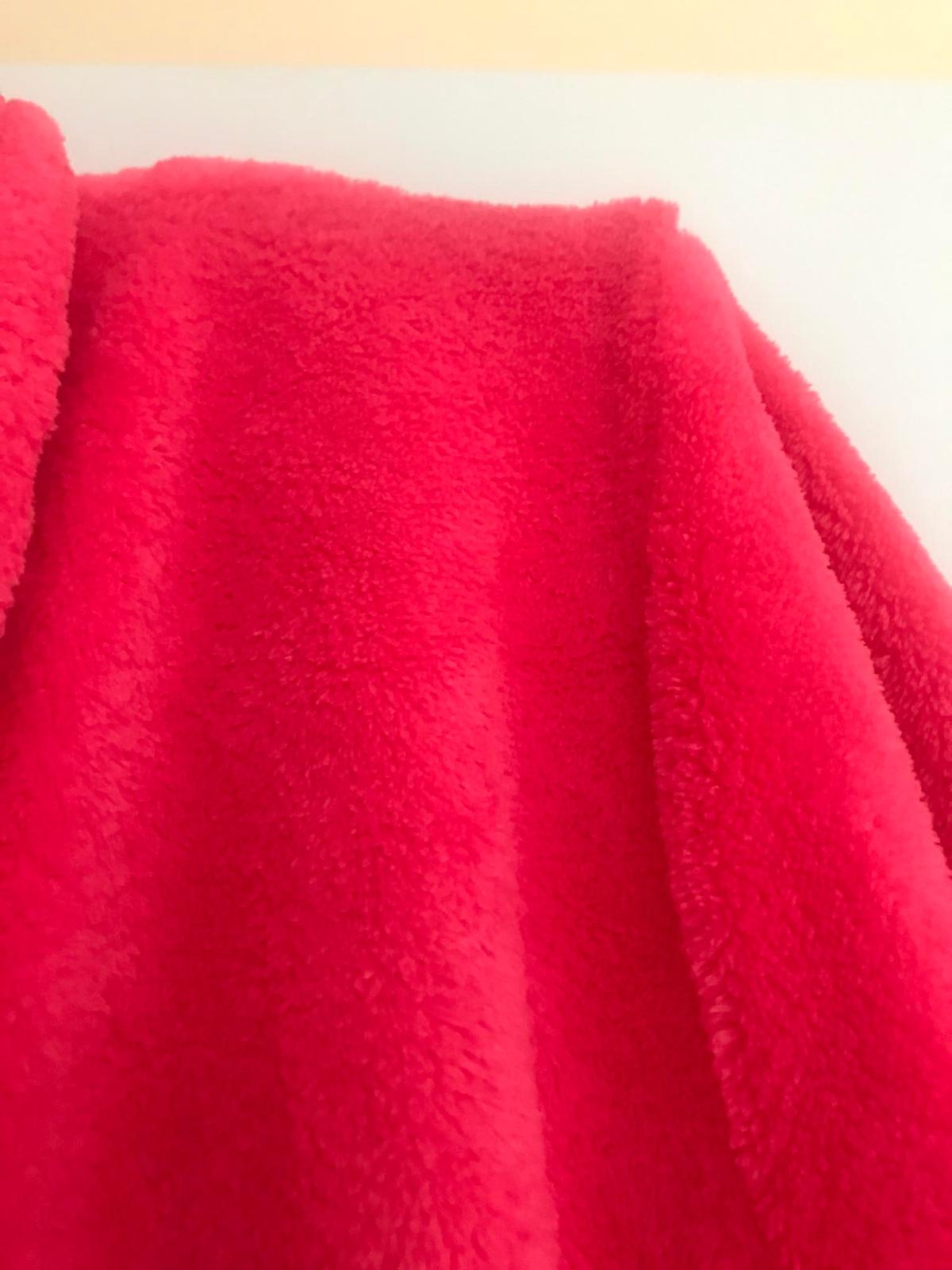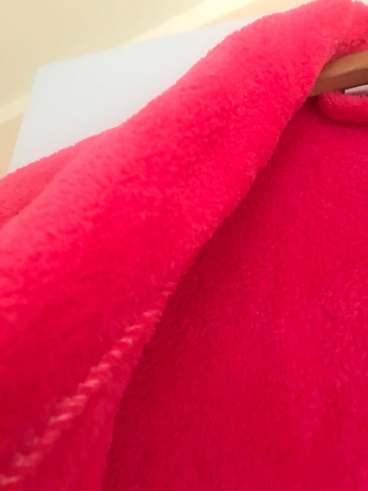 luxusný huňatý teplý dlhý župan v prekrásnej ružovo-červenej farbej,veľké vrecká,veľmi ľahký teplý,ako bývajú tie husté kvalitné deky,dlžka celkom = 130 cm,dlžka od pazuchy smerom dolu,meraná na boku = 96 cm, rukáv = 60/61 cm,šírka meraná podpazuchami na zadnom diele = 78/79 cm