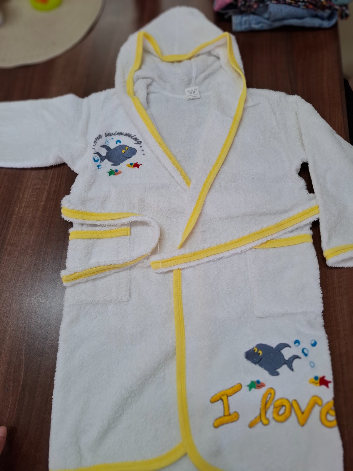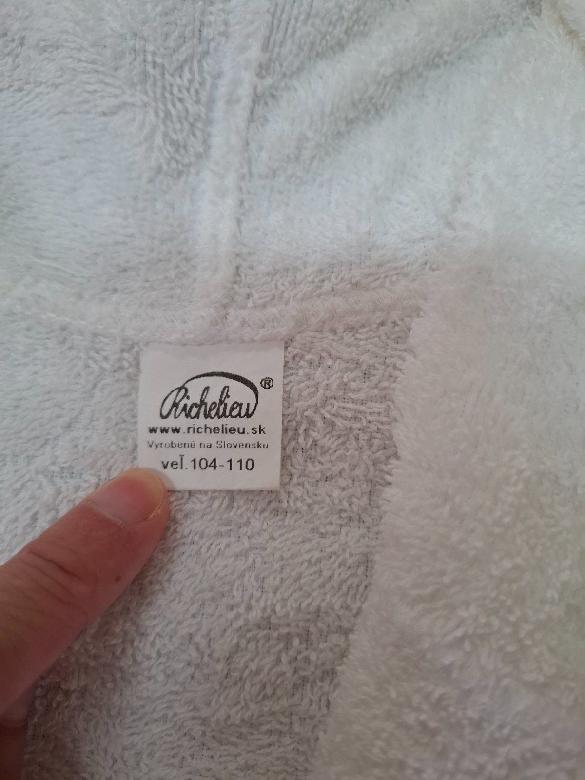 Smotanovo biely mäkkučký bavlnený froté župan. Minimum nosený úplne bez poškodení. Kapucňa, dlhý rukáv, pás na zaviazanie. Prešitá aplikácia vpredu aj vzadu. TOP STAV