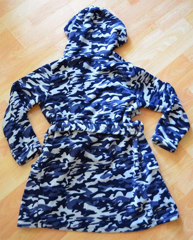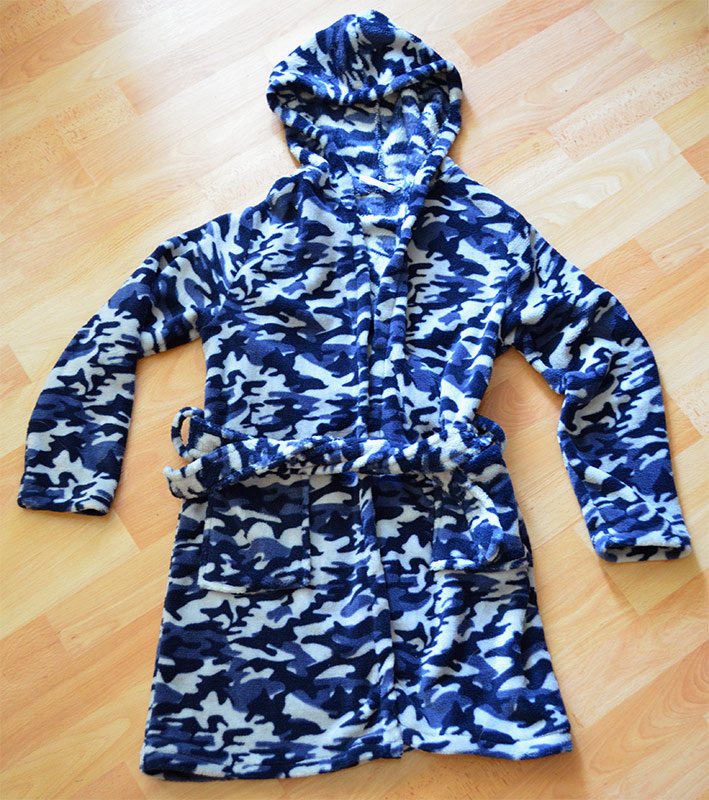Makucky, pohodlny. S kapucnou, s opaskom napevno, ma 2 vrecka, v pase vzadu je guma.