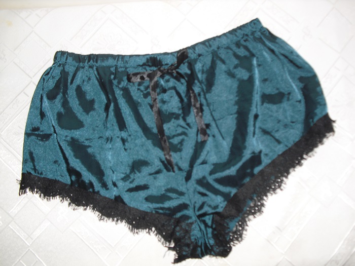 predam nadherne zelene kratasky na spanie, vybornom stave, velkost uvedena l. zdobene na spodu krajkami a ozdobnou satenovou stuhou na predu, v pase elasticka gumka 35 cm x 2 az 49 cm x 2, 29 cm vyska od pasa predok k rozkroku.