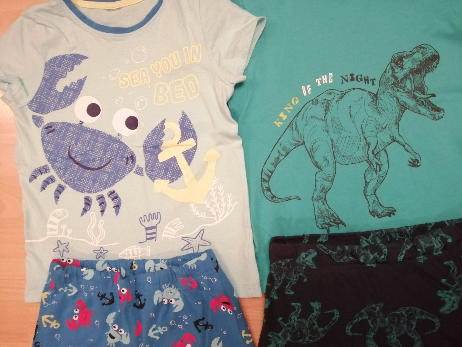 Pekne bavlnené pyžamá č. 122/128.To s krabom je bledomodro tmavomodre, to s dínom je zeleno modré. Cena spolu plus posta.