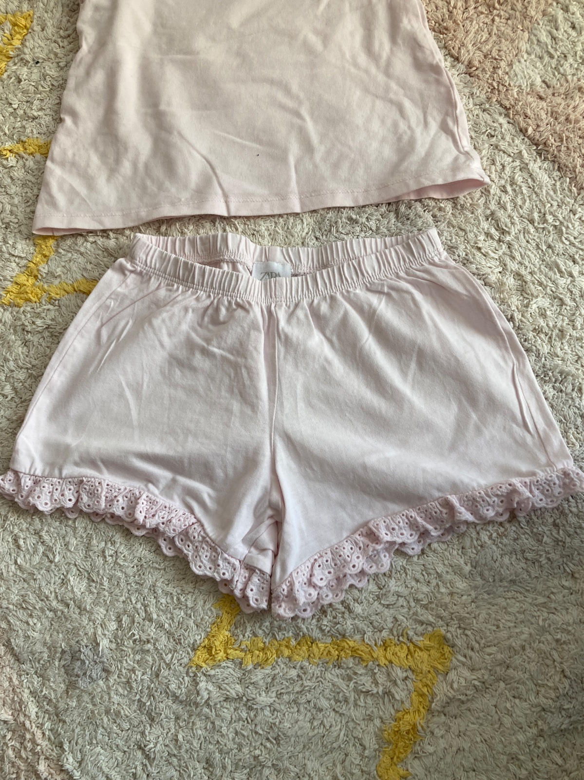 Ponukam na predaj letne bledoruzove pyzamo znacky Zara. Rukávy aj sortky ukončené maidetovou látkou. Stav ako nove. Visacka udava velkost 115, sedi na 110 aj menšiu 116. Kupovane nové, nosene 1 dietatom.