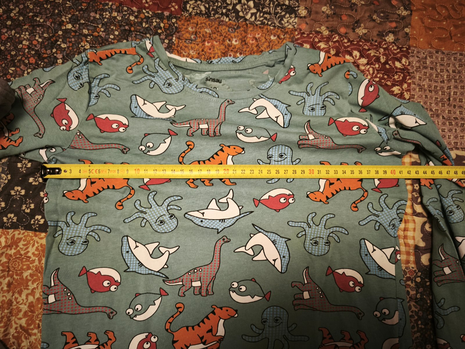 Pekný nosený stav. Uvedená veľkosť 140 ale podla mňa nositelné od 134. Dĺžka nohavíc 71 cm, rukáv od krku 51 cm.