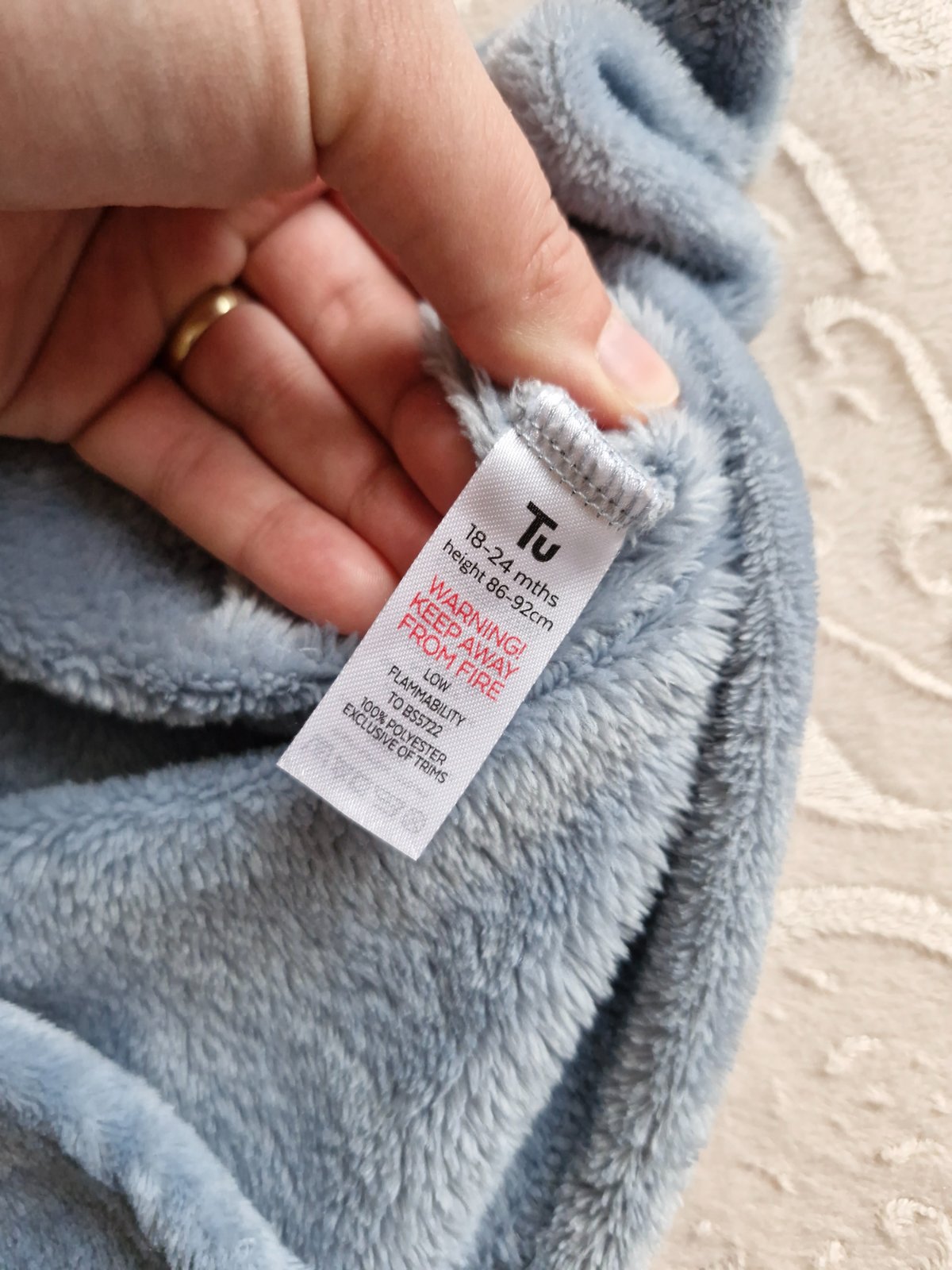 nový dámsky fleesový svetlo modrý župan s kapucňou, so sivým vzorom, opaskom a vreckami vpredu, stredne hrubý, príjemný hrejivý materiál, zloženie : 100 % polyester, značka: Towardo uvádzaná veľkos...