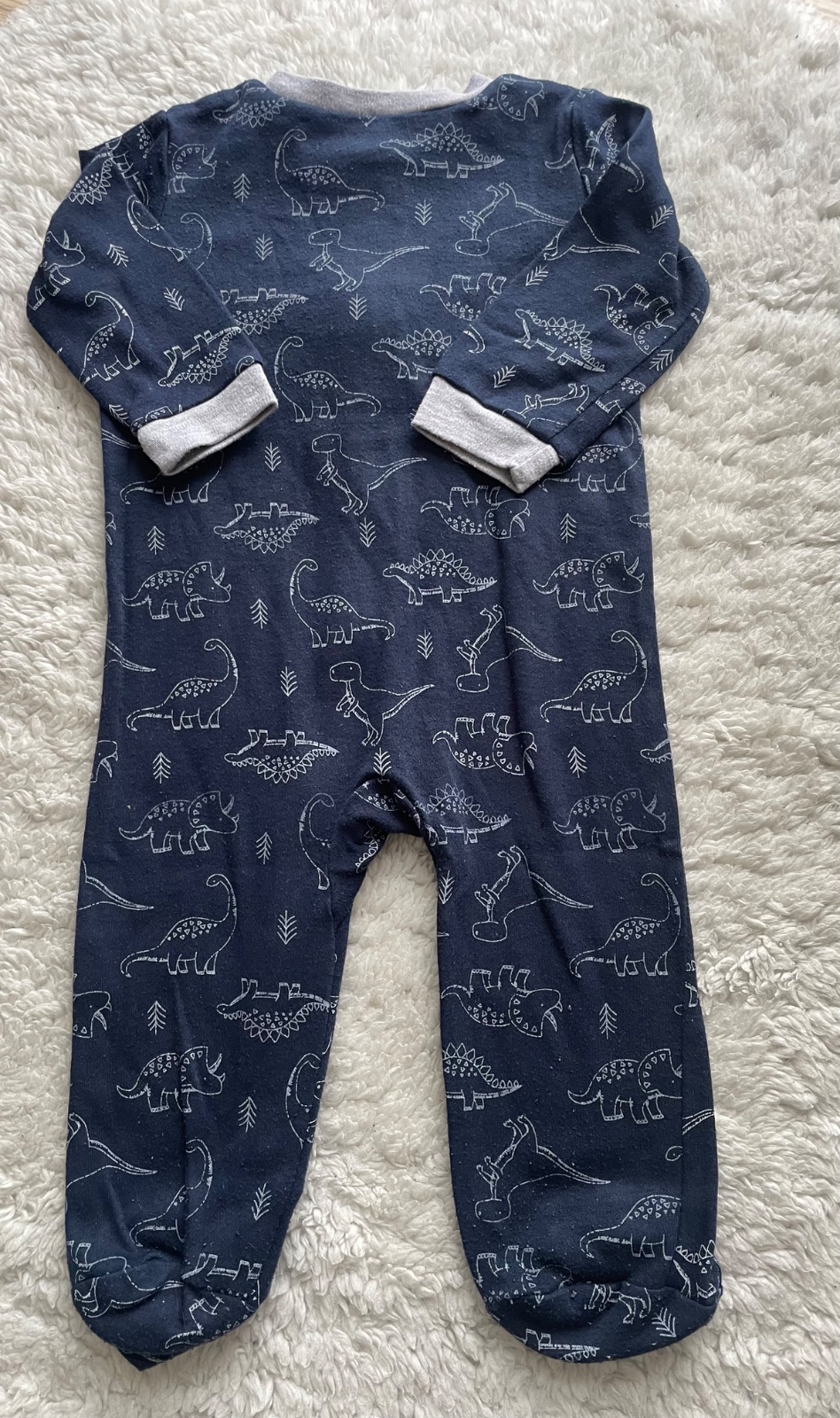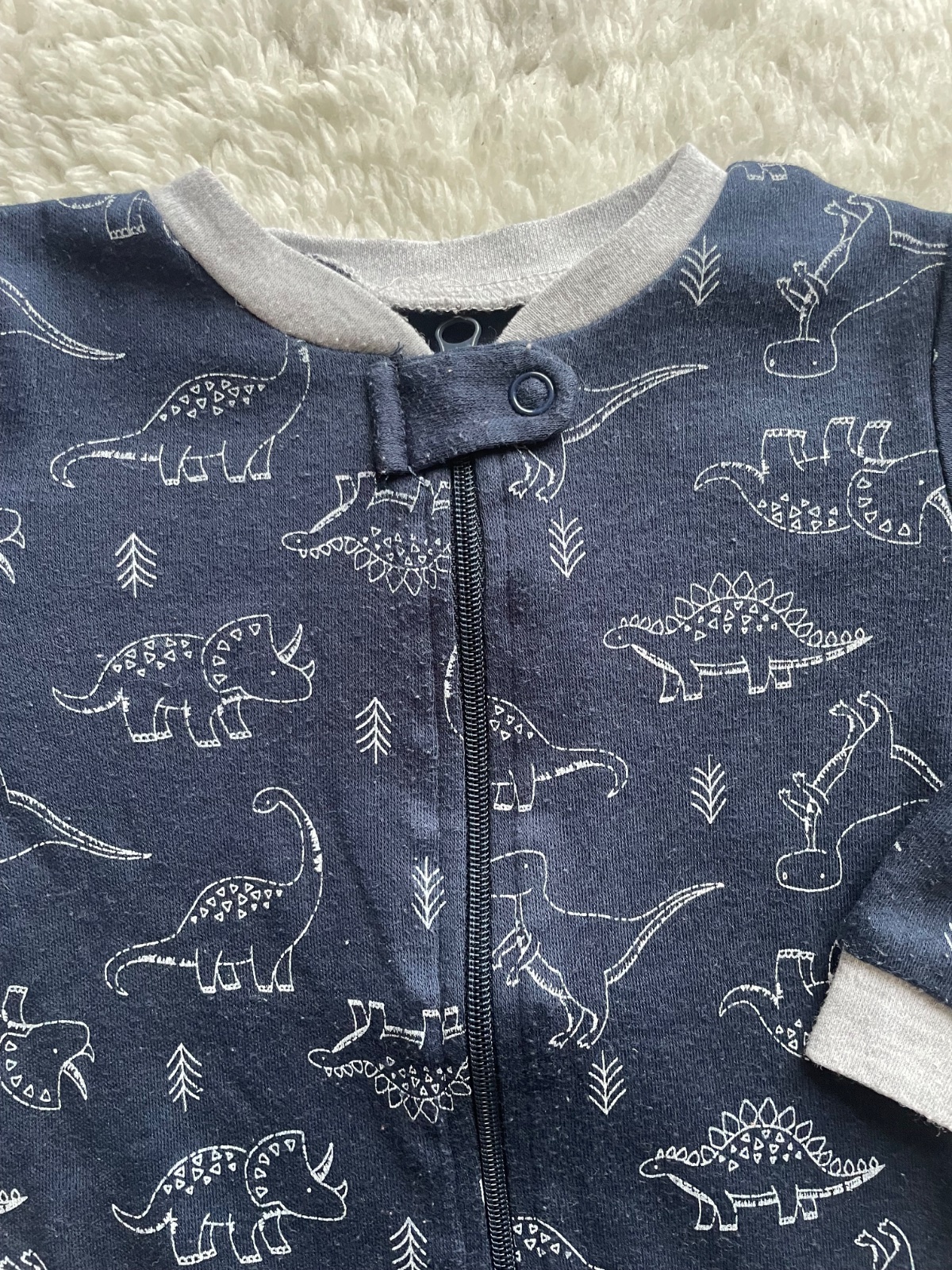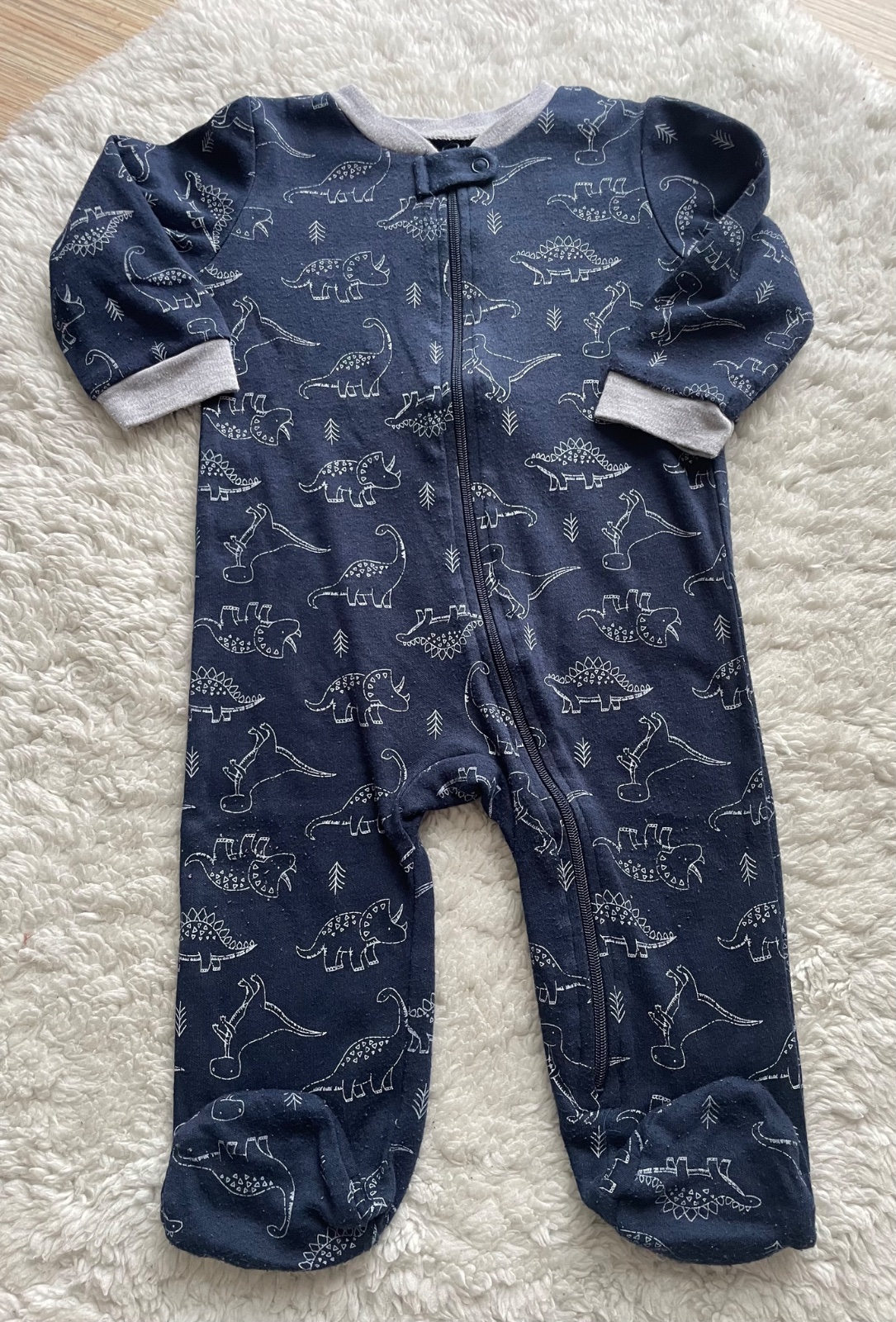 Tmavomodre zipsove pyzamko s dinosaurami a sedymi patentami, velmi prijemny material, bez dier a flakov, miestami zmolky, velkost 3-6 m, znacka Kyle&Deena