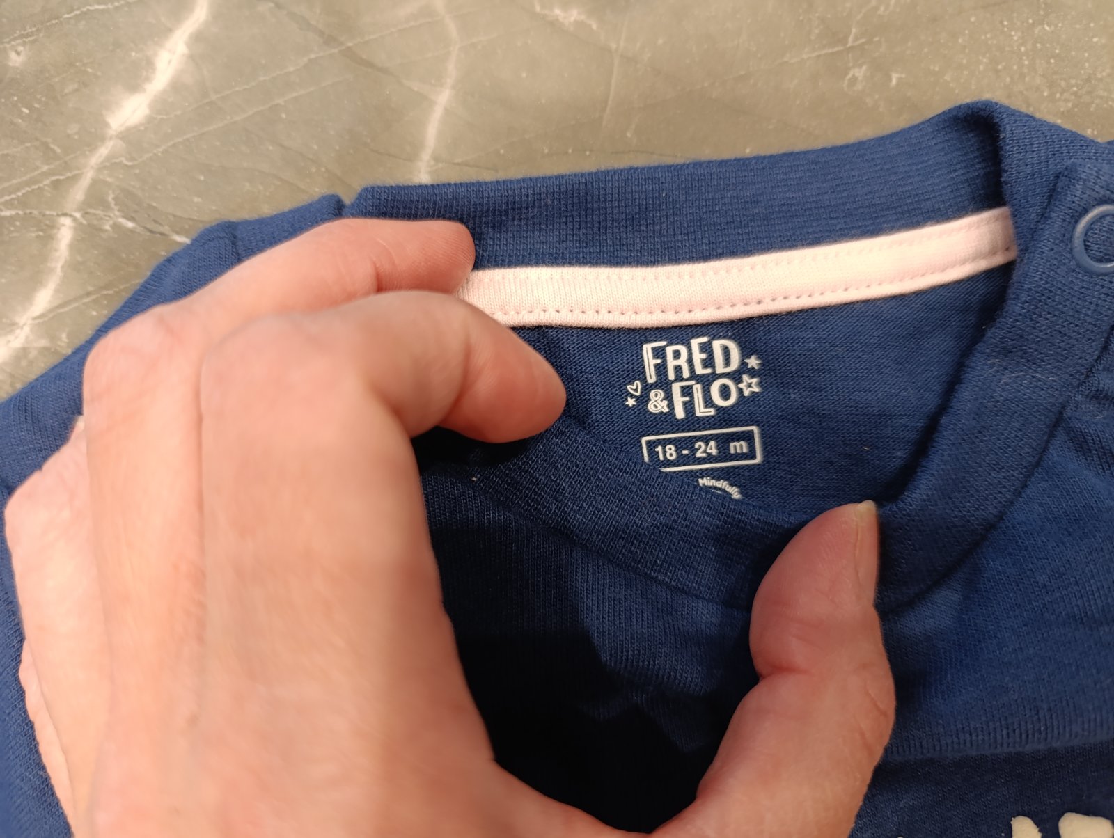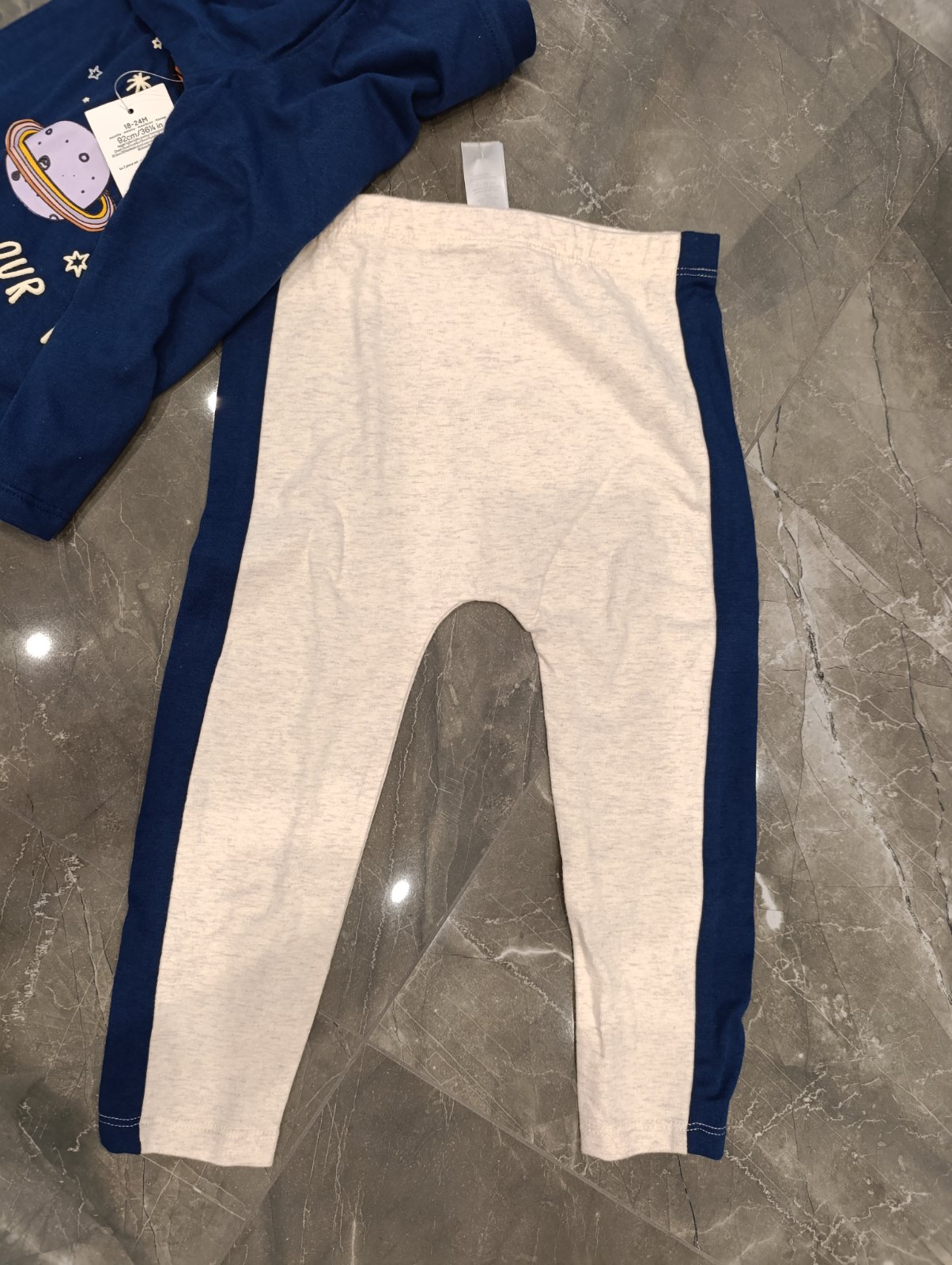 Skladom. Zloženie: 95% bavlna, 5% elastan Dvojdielna sada-blúzka s dlhým rukávom s lesklým nápisom v strede. Nohavice s efektným, tmavomodrým a červeným karovaním, ukončené manžetami na členkoch.