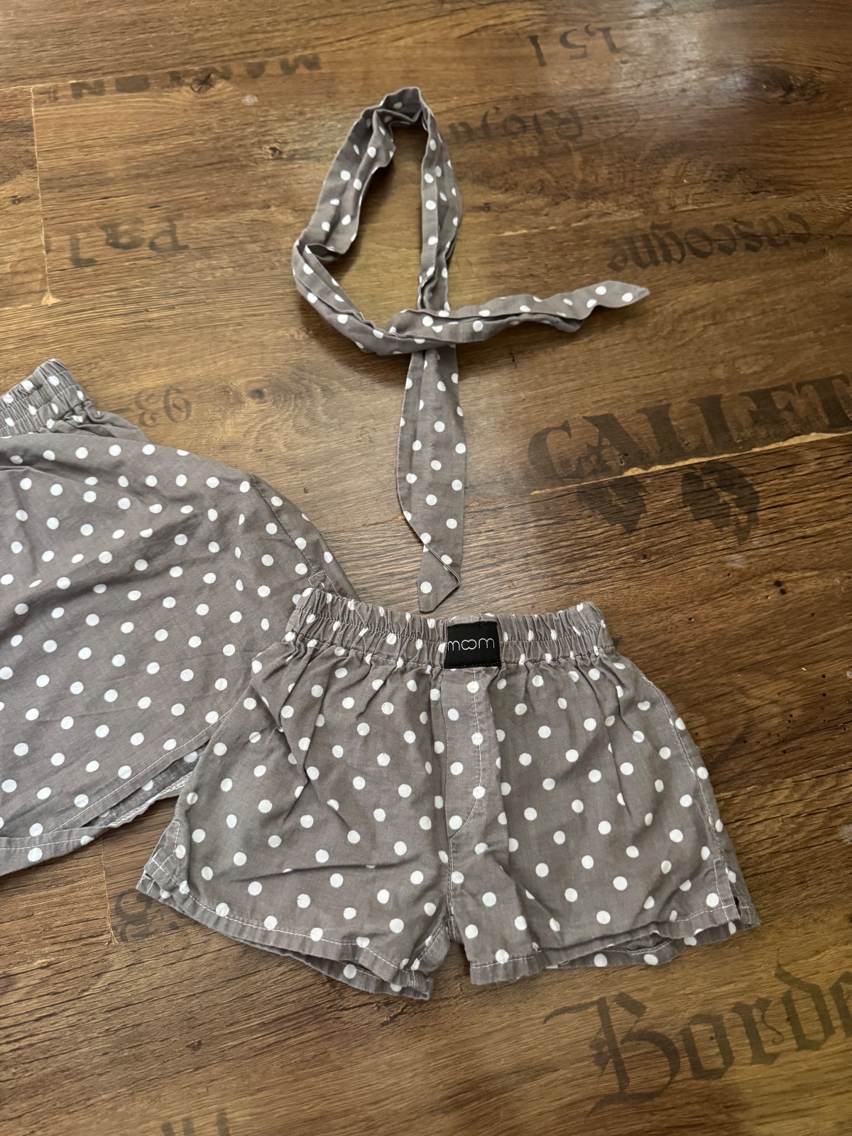 Ponúkam krásne bodkované kraťasy slovenskej výroby značky Moom collection. Sú také bledohnedé s bodkami a podľa mňa môže malé kraťasky aj dcérka aj syn. Veľkosť dospelých je tak S/M a detských okolo 1-3roky. Súčasťou je aj šnúrka do vlasov. Krásny set, bol minimum nosený ale farba je jemnučko vypratá. Poštovné podľa taríf.