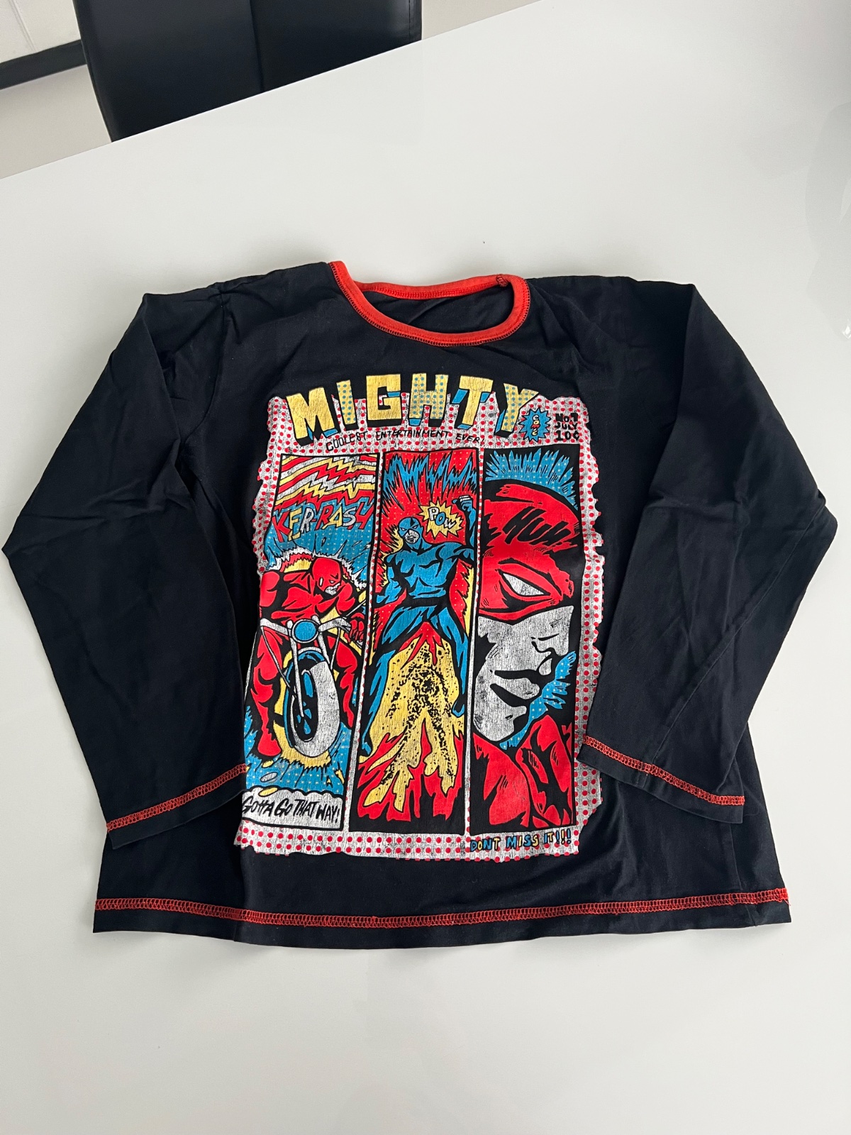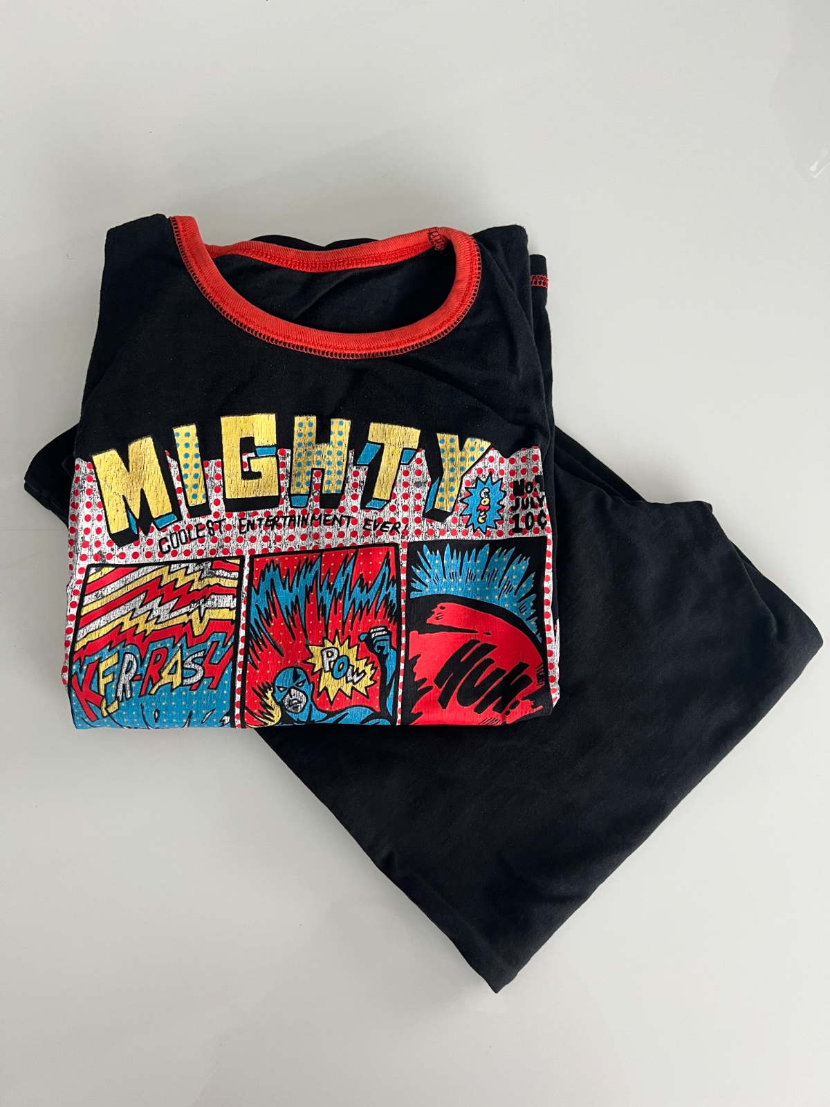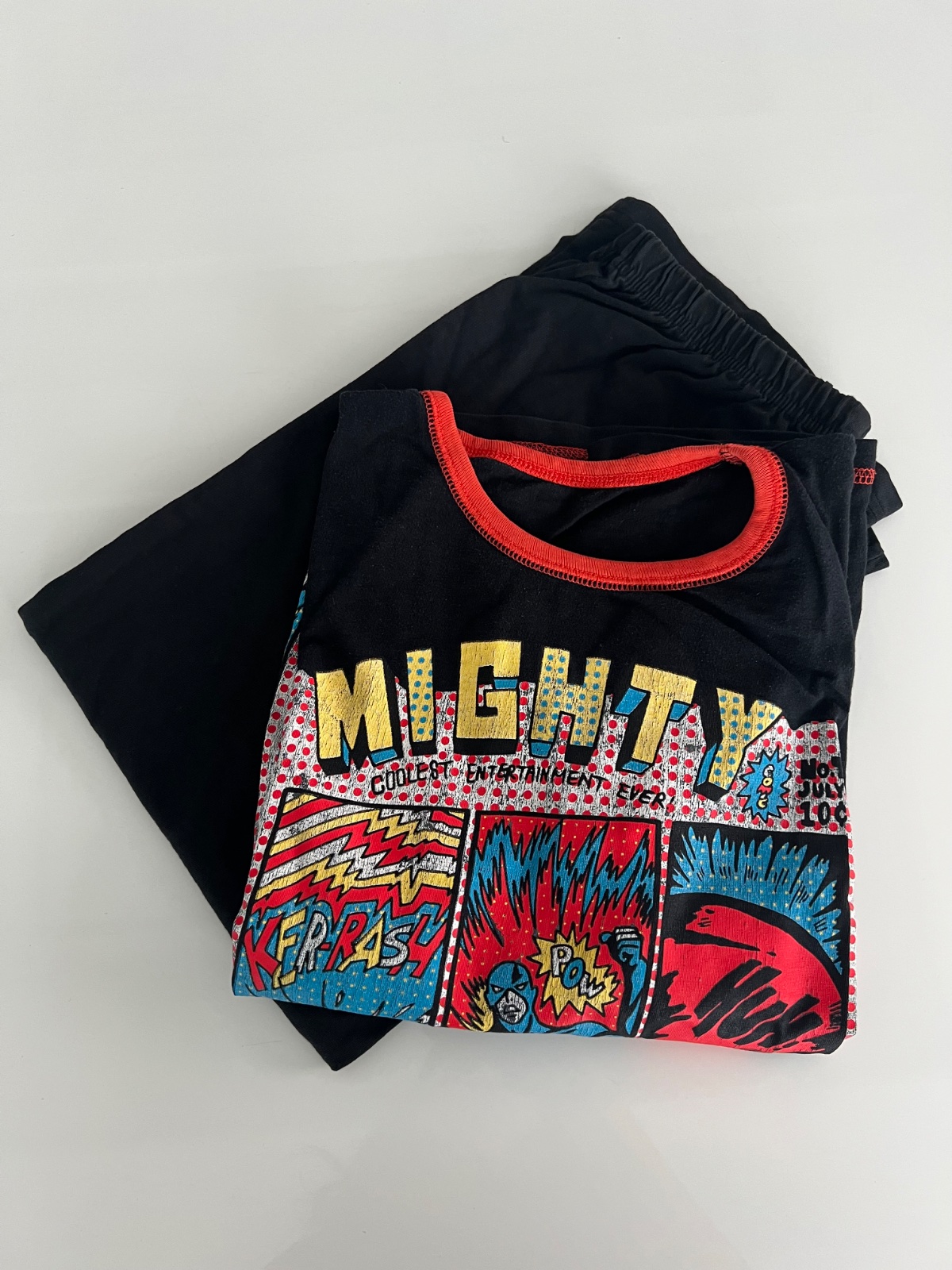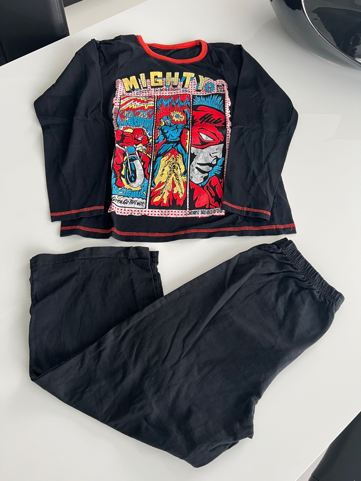 Detské bavlnené pyžamo. Pyžamo tvorí tričko s dlhým rukávom a dlhé nohavice. Tričko zdobí potlač obrázku. Farebné dlhé nohavice majú v páse gumu a sú ukončené elastickými lemami. Bavlnený materiál...