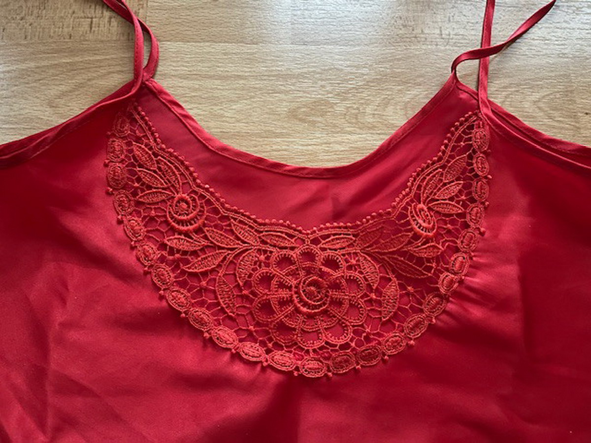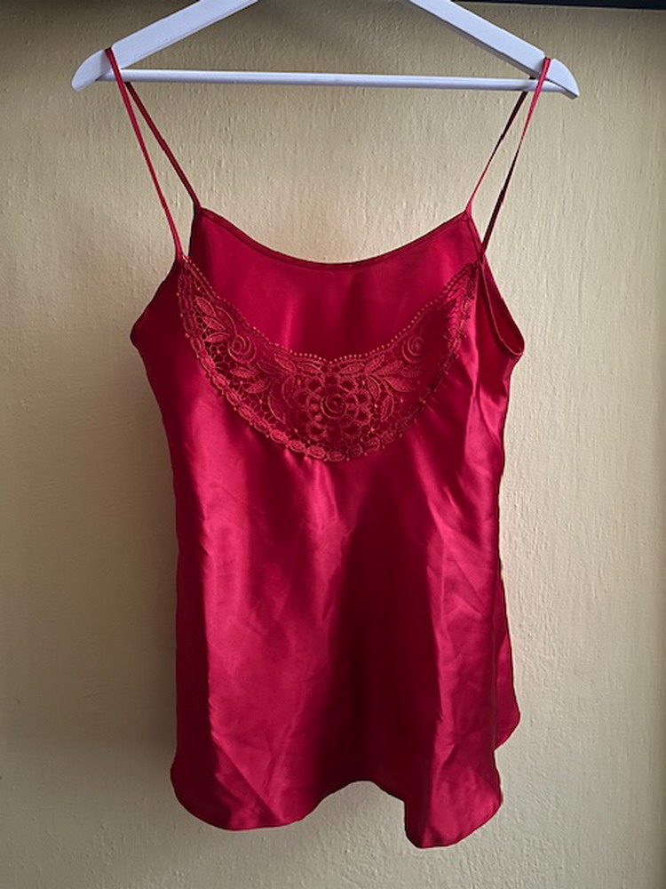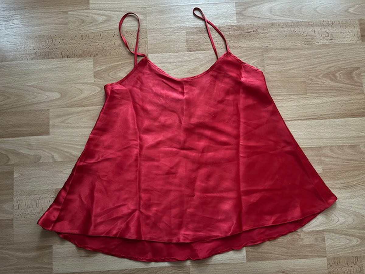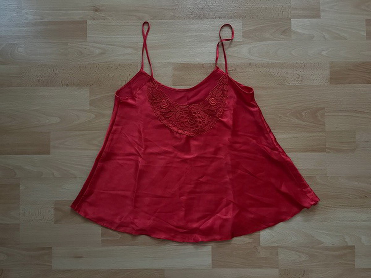Krátky top na spanie v červenej farbe, veľkosť je uvedená 40 (skôr menšia - tipujem 38), materiál: 95% viskóza, 5% lycra