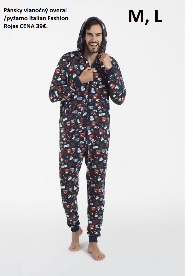 1. MODEL Vianočný pánsky overal /pyžamo ITALIAN FASHION ROJAS, Zdobený fantastickým vzorom roztomilých koláčikov je ako stvorená na leňošivé večery doma. Prírodný materiál bude príjemný k pokožke a voľný strih, celoprepínací zips a kapucňa poskytnú voľnosť a pohodlie. Bavlnený pánsky oblek na spanie je zakončený manžetami na rukávoch a nohách, čo zvyšuje komfort nosenia. Máme ešte velkost M aj L. Pôvodne 63,90€, teraz 39€. Balený v sáčku.