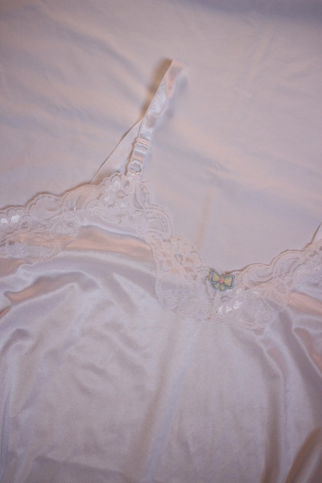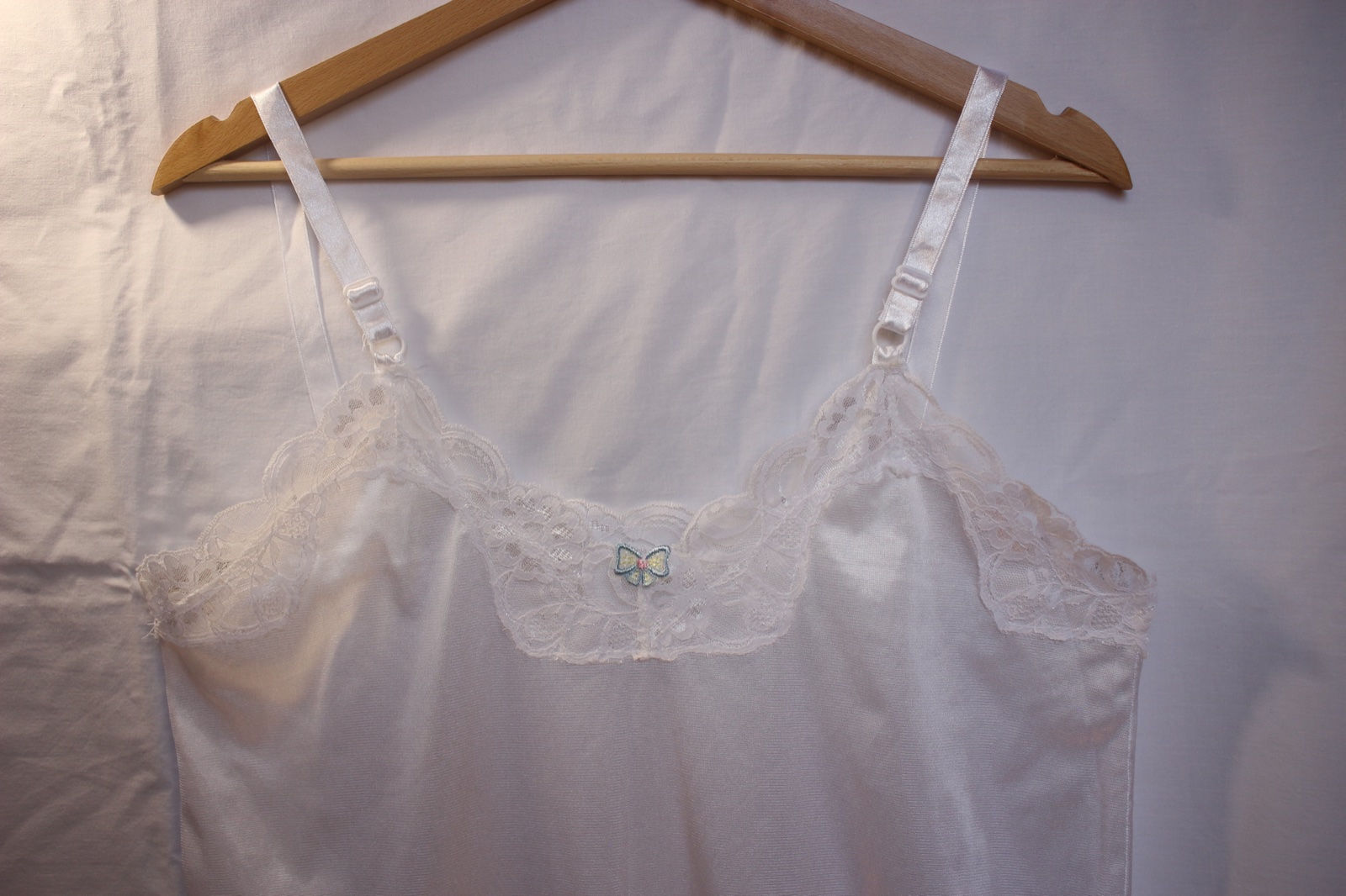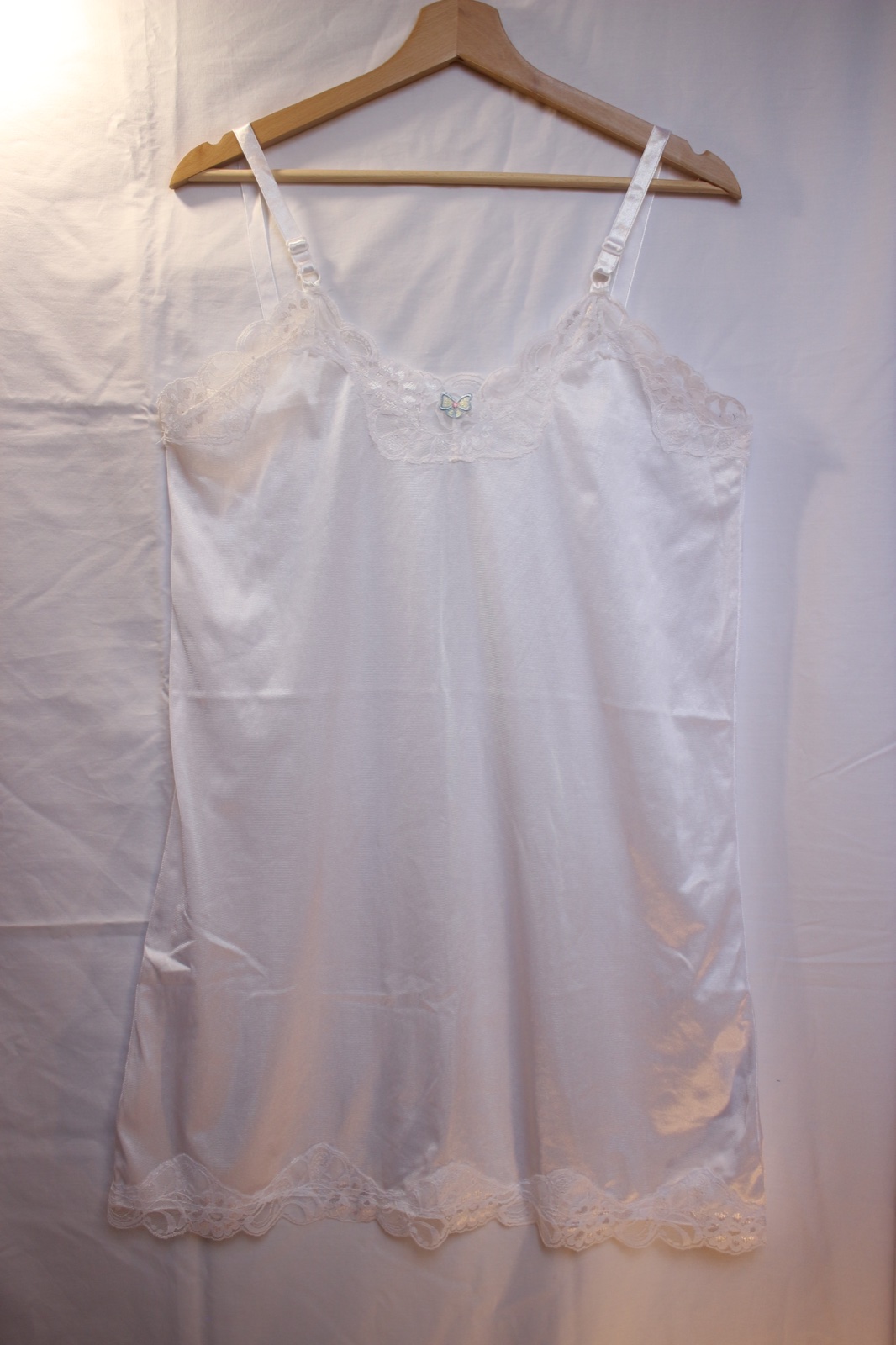 Táto dámska biela nočná košeľa je nežná, ženská a nesie v sebe romantický vibe 90. rokov.