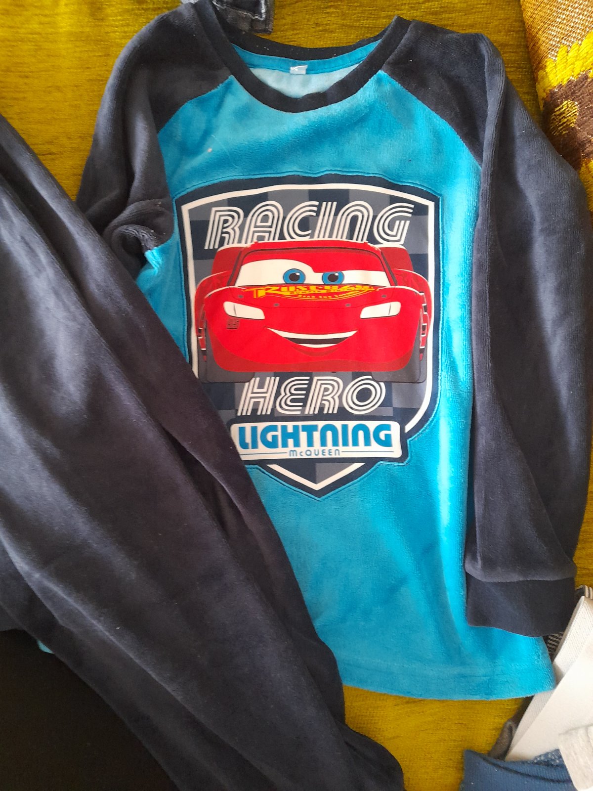 veľ. 122/128 Bavlnené pyžamko s lietadielkom Dustym, 100 % bavlnka, pyžamko nemá žiadne poškodenia - žiadne dierky, zašívania , ani fľaky ,,, jedine aplikácia je trošku popraskaná - zohľadnené v...
