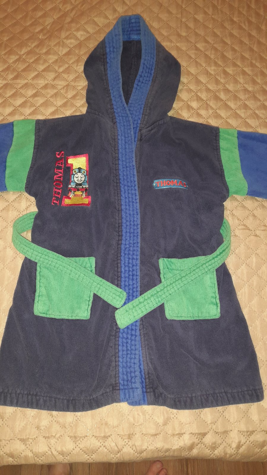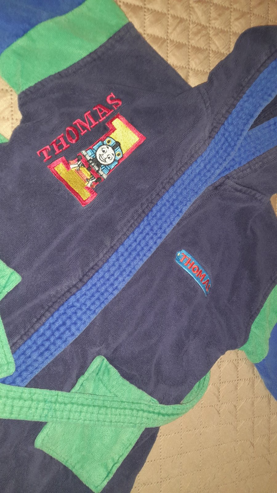 Velmi oblubeny a kvalitny zupancek. Asi skor pre chlapcov kedze je tmavomodry a teda s motivom z rozpravky Thomas and friends ( vlacik Tomáš). Nema ziadne poskodenia, jedine na farbe uz vidno pranie. Ale inak velmi dobry stav.