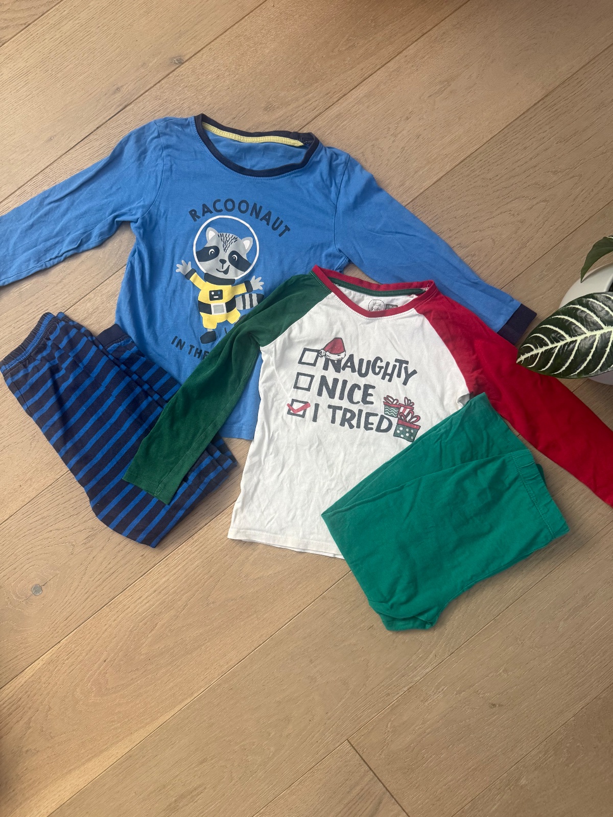 Bavlnene pyžamká, pekne ladiace vyskladane z viacerých značiek, velkostne sedia na veľkosť 116