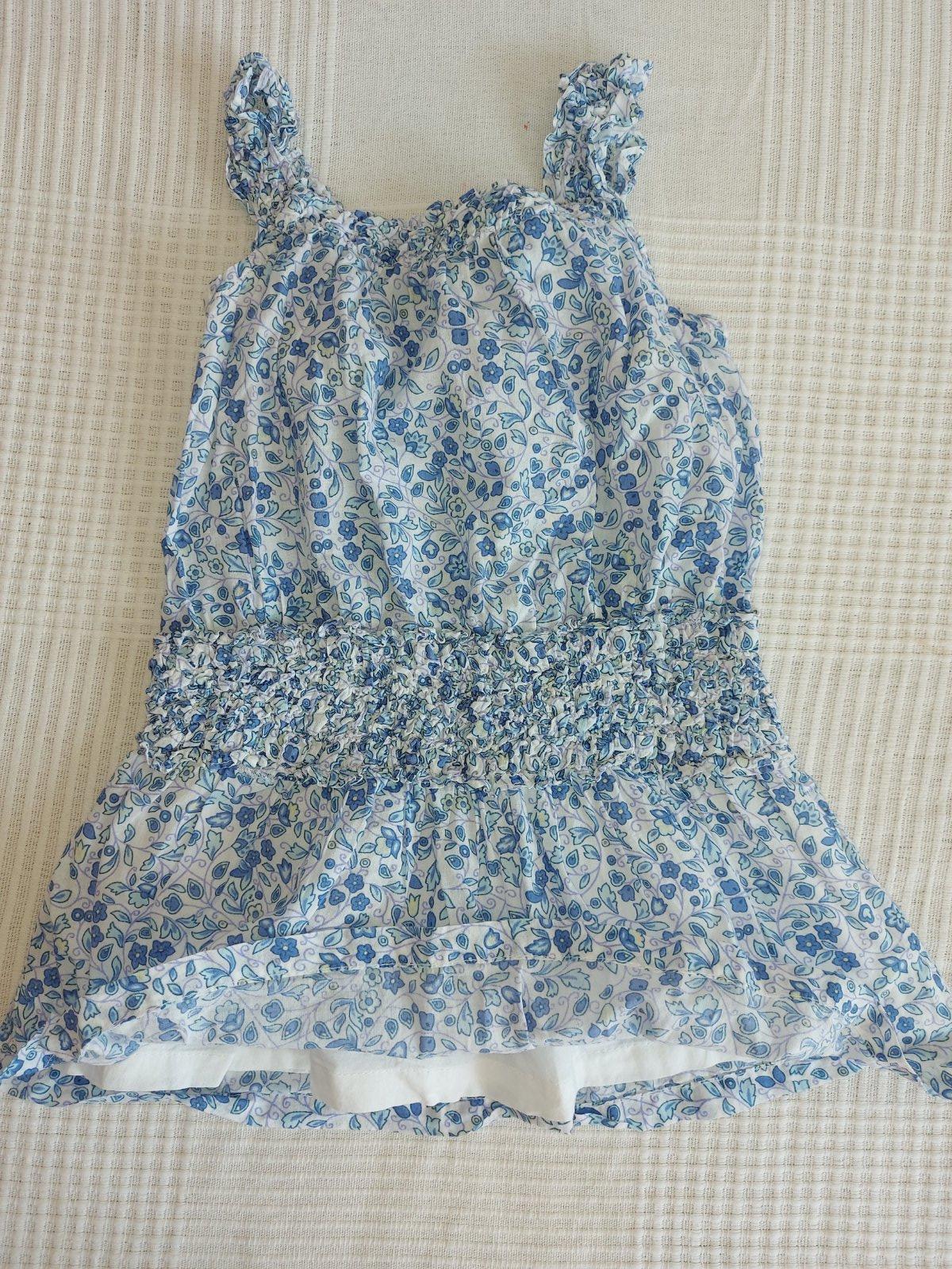Dievčenské šaty bez rukávov, letný vzor, na ramene zapínanie na cvoky, elastické, materiál 100%bavlna. NOVÝ TOVAR s visačkou! Šaty:dĺžka meraná vzadu:51,5cm,pod pazuchami meraná šírka:2x29cm,od p...