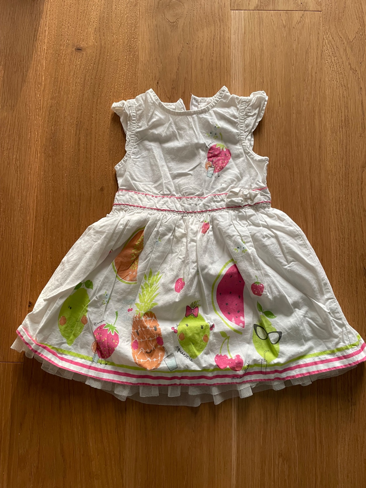Predám veselé šaty so vzorom ovocia s krásnou podšitou sukňou (robí efekt tylovej sukne) značky Blue seven zo 100% bavlny veľkosti 74 (9-12 mesiacov).