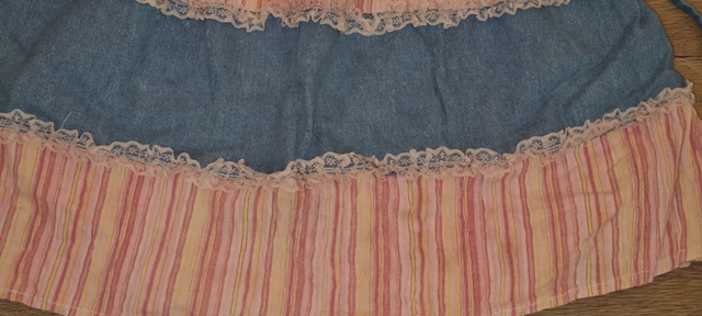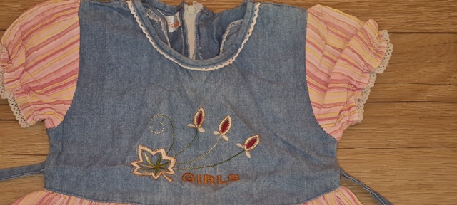 riflové časti s ružovou - žltou krepovou látkou, na volánoch je čipka, vpredu vyšívané, vzadu zips, perfektný stav