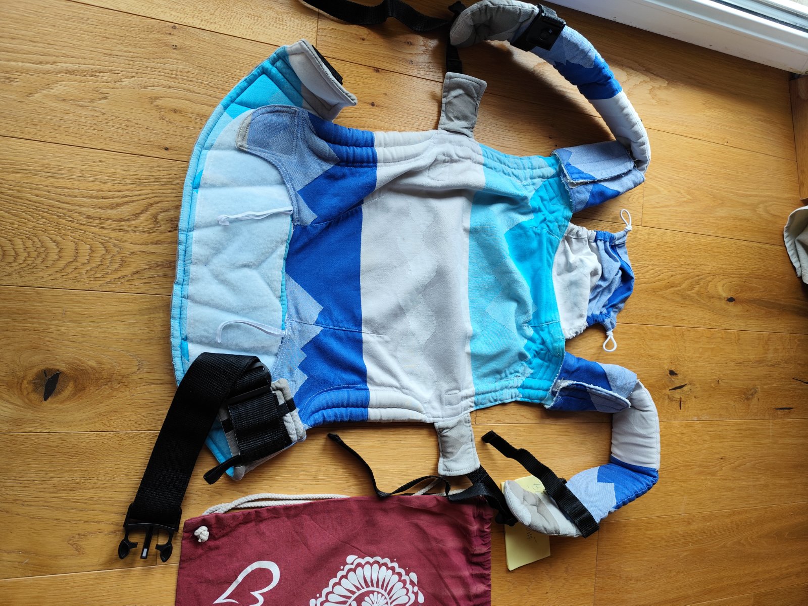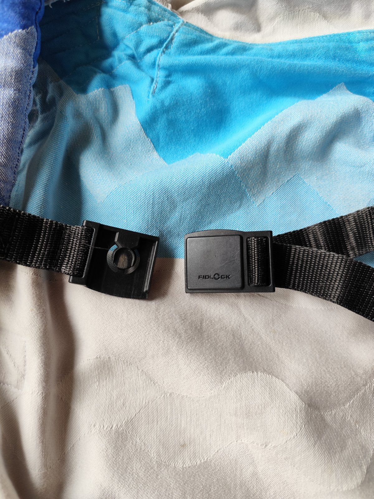 Hrudná spona je magnetická, zvnútra sú od moyo dorobené gumky na zrolovanie nosiča keď sa práve dieťa nenosí nech neplantá pod nohy. Ľanové zloženie som ocenila hlavne v lete a s pribúdajúcimi kilami môjho syna, mala som pocit, že lepšie rozložil váhu. Pri veľmi detailnom skúmaní je vidno mierne zažltnutie okoli kapucky a popruhov od slín a mini tmavý fliačik z vnútra nosiča. Bordové vrecko má od slnka vytiahnutú farbu.