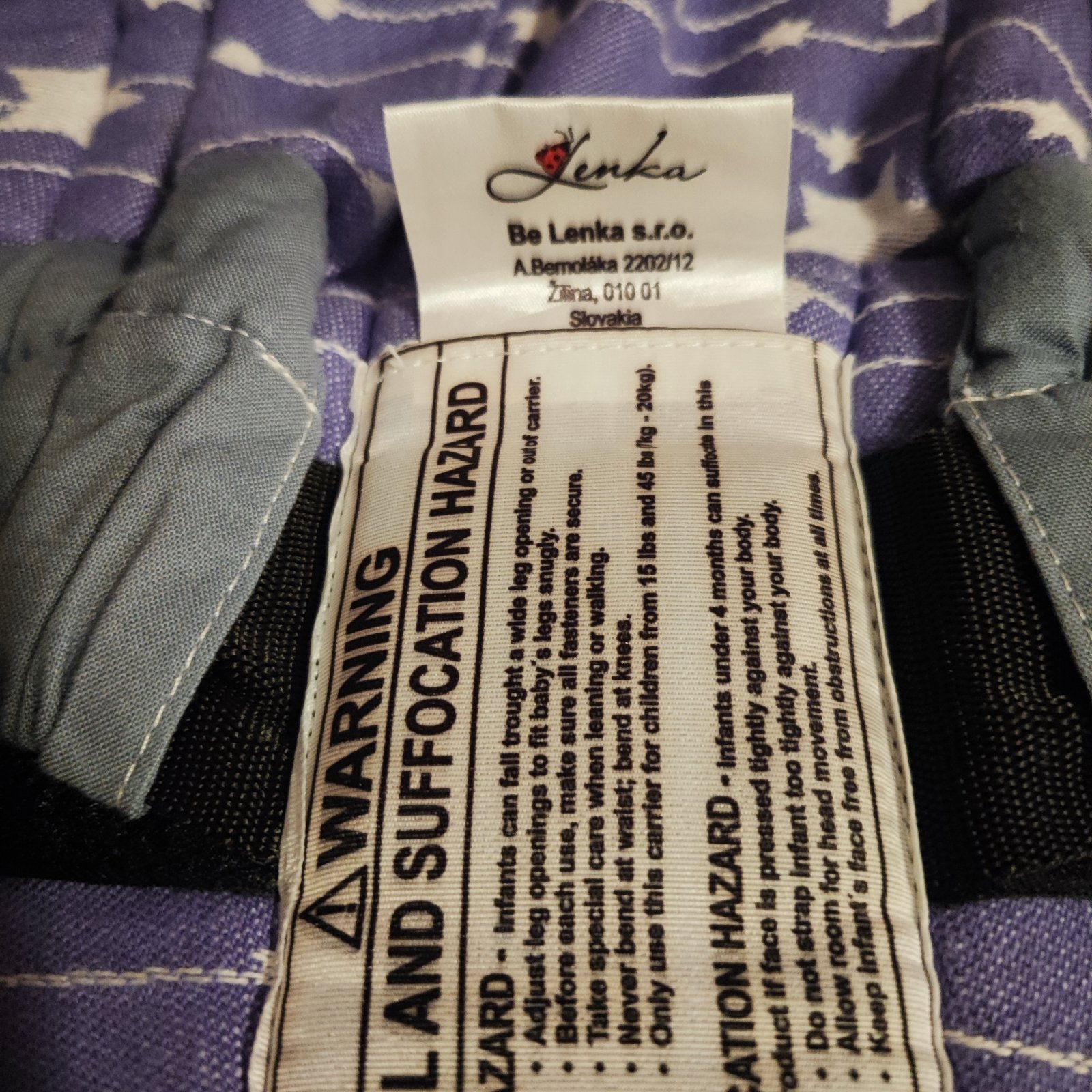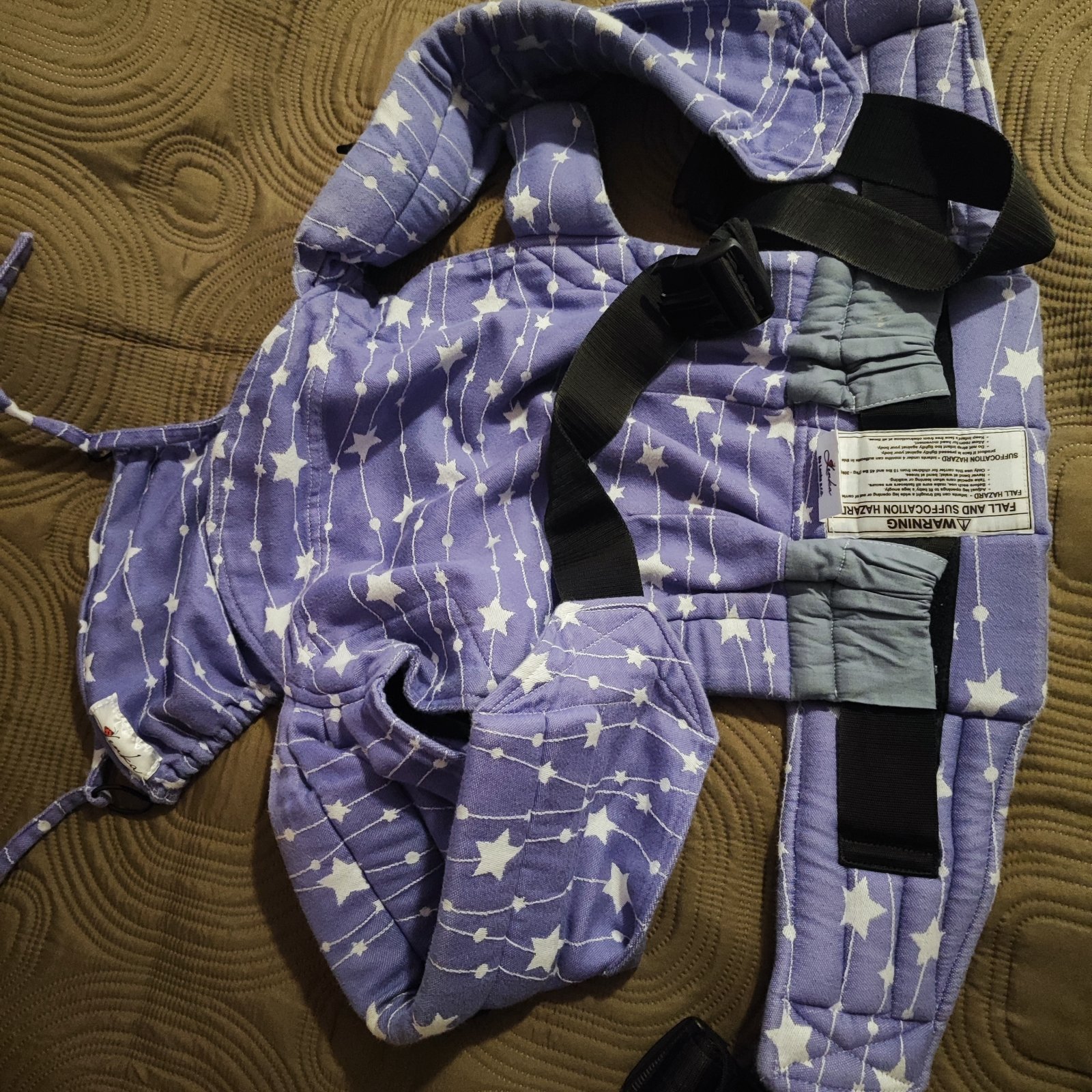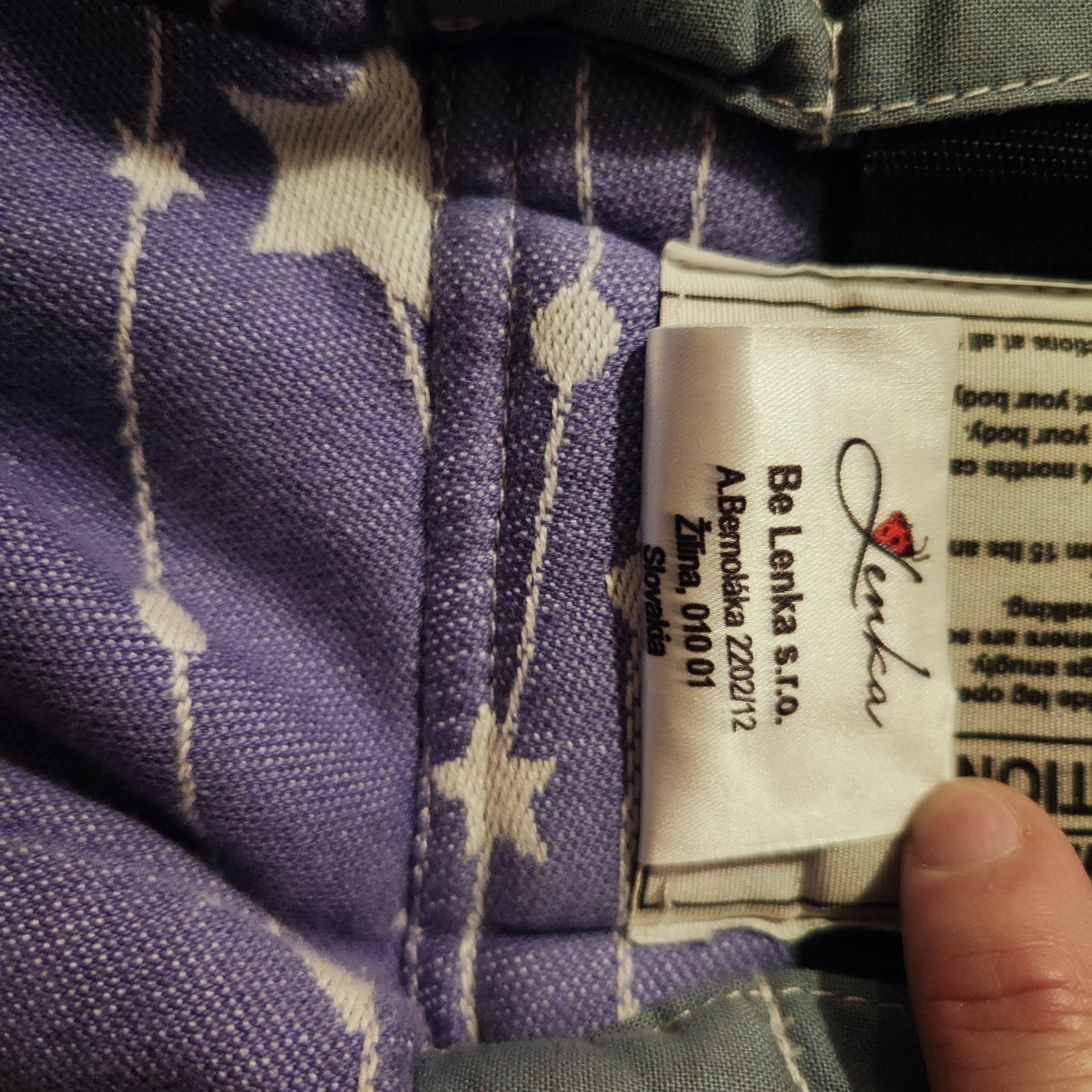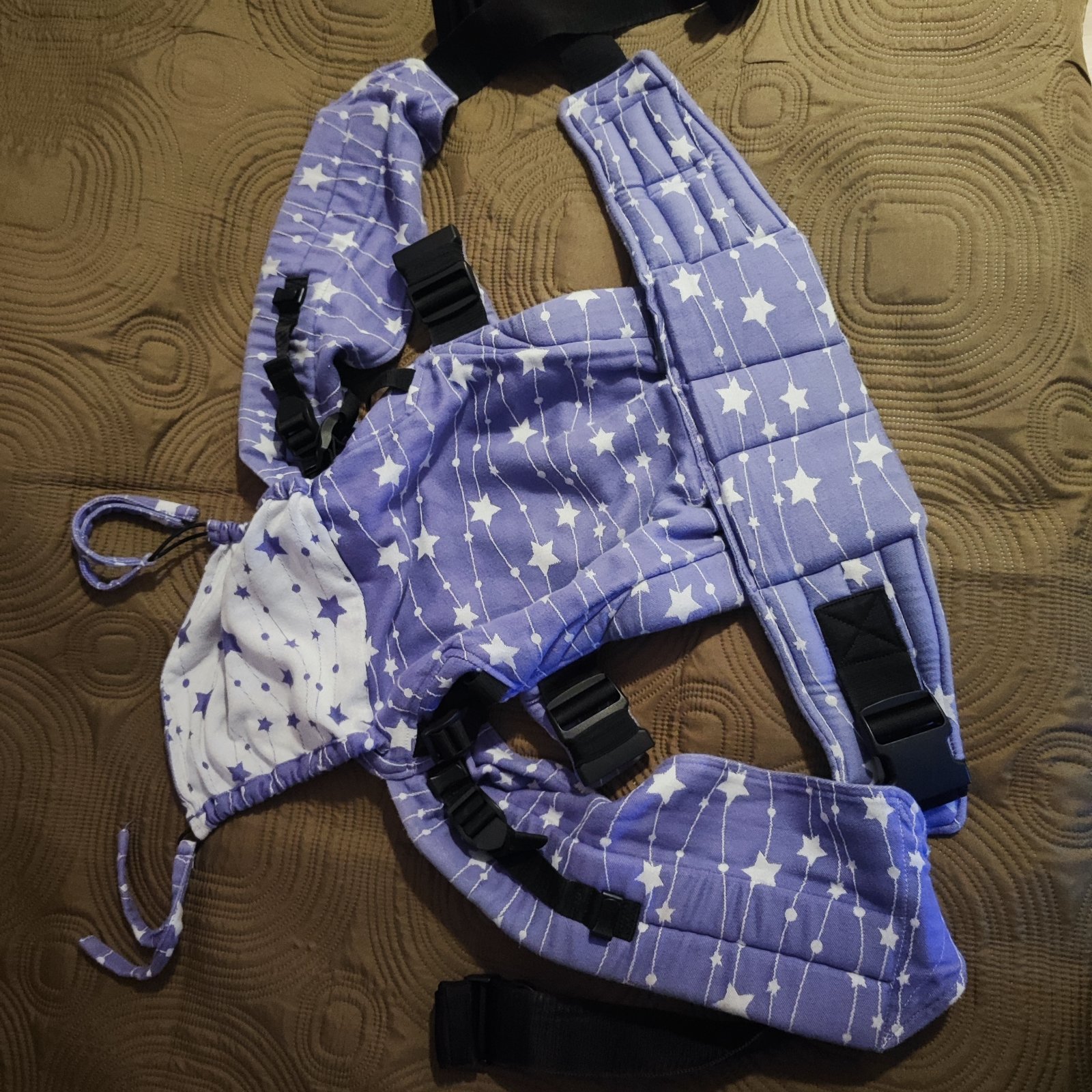 Nosič be lenka, fialový s bielymi hviezdičkami, nemá vyblednuté miesta ani fľaky.