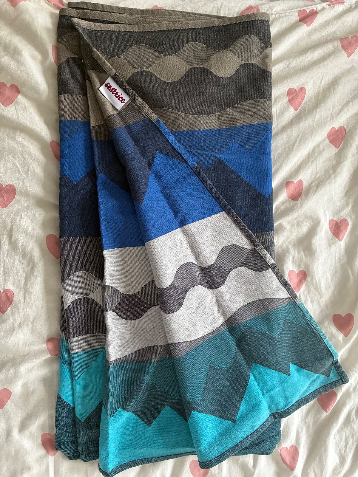Šatka Sestrice Folk Azure veľkosť 5. Ideálna pavučinka na novorodeniatko, super na leto. Zloženie: 54% česaná bavlna, 46% tencel Gramáž: 180g/m2 Super stav.
