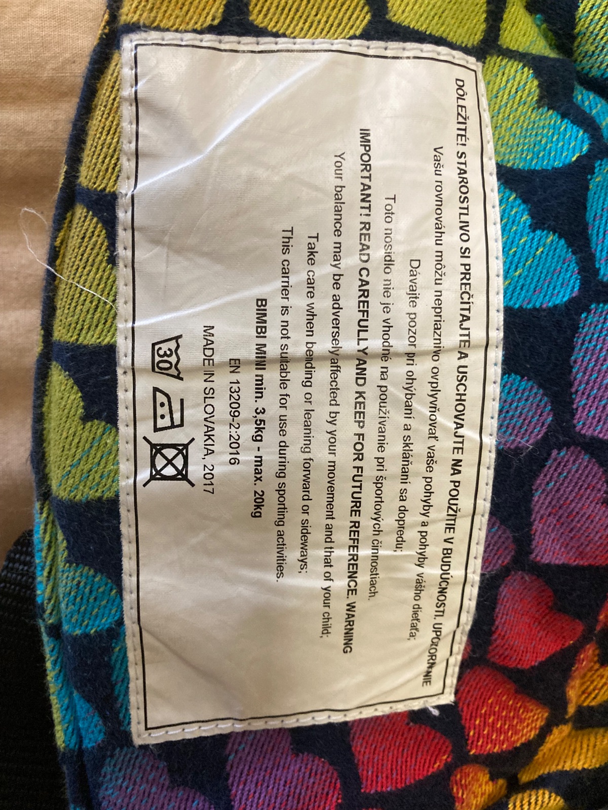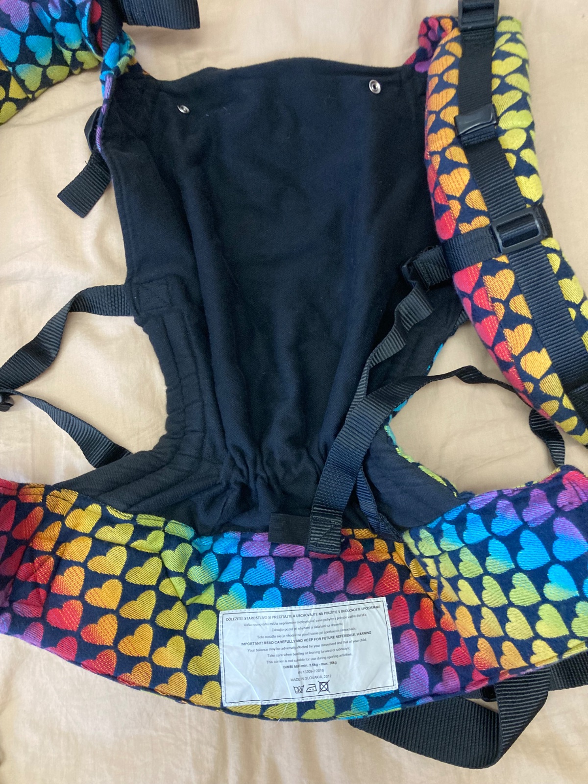 Nosic vhodny od 1 roka do 5 rokov. Nosnost az 25 kg. Nami par krat pouzity. Farby su v skutocnosti viac sytejsie, krasny ludovy vzor. Moznost nosit v predu aj vzadu.