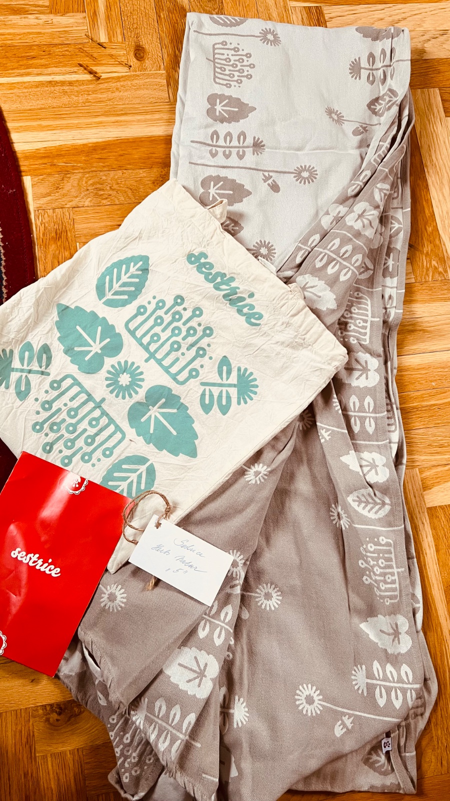 Bavlnena nadherna satka Sestrice bylinky vo velkosti 5 (ja mam konfekcnu velkost 38 a bola mi perfektna). S laskou uzivana, s este vacsou laskou obstaravana:) prana len v setrnom pracom prostriedku, podla pokynov vyrobcu. Nefajciarska domacnost, psik na dvore.