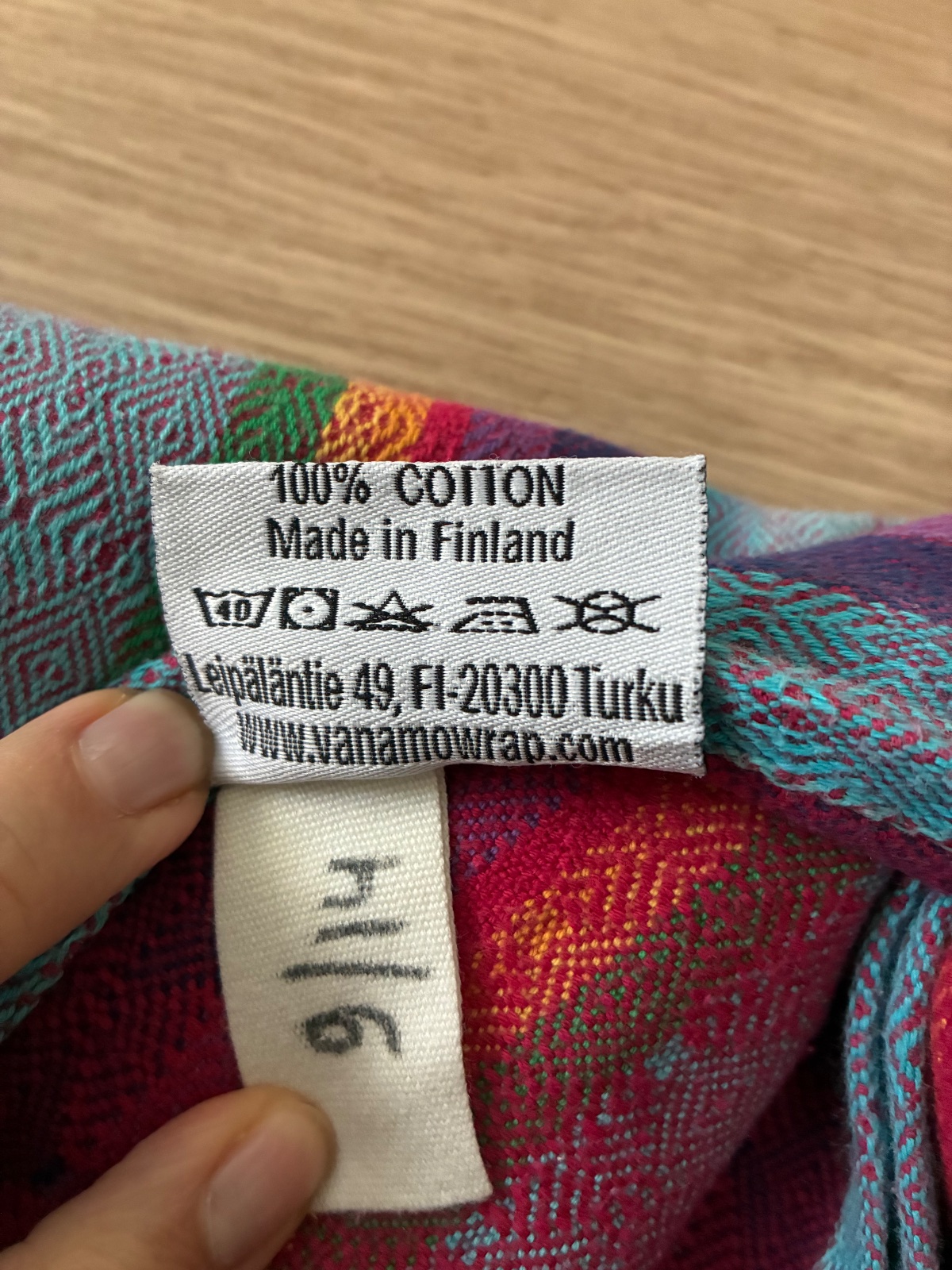 Používaná skvelá šatka na nosenie detí. Krásne sýte pestré farby. Značka Vanamo. Je to perfektná fínska šatka. Nám slúžila výborne, odporúčam ju všetkými desiatimi. Materiál 100% bavlna.