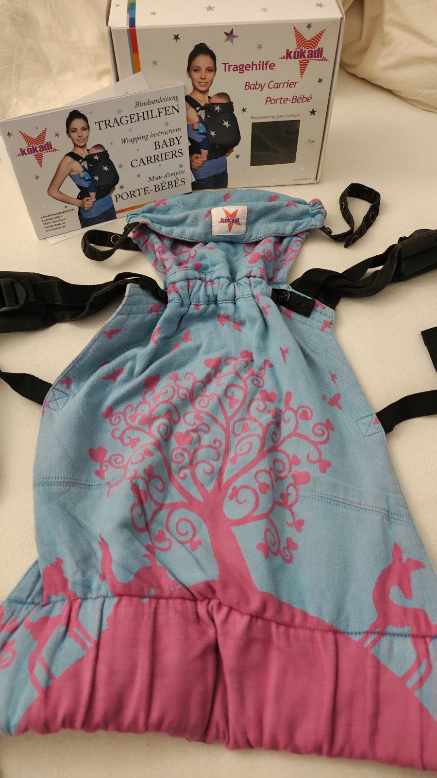 Náš veľmi obľúbený nosič Kokadi Erna im Wunderland v bezchybnou stave. Nemá žiadne zatiahnuté. Čierna farba popruhov je od slnka a praním vyblednutejšia, ale je to perfektný ergo nosič, na ktorý nedám dopustiť. Látka je veľmi príjemná mäkkučká.