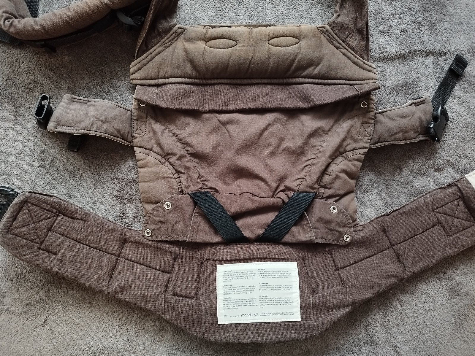 Nosič manduca je krásnej tmavohnedej farby. Farba nie je vyblednuta. Prany asi dvakrát v detskom pracom prášku.