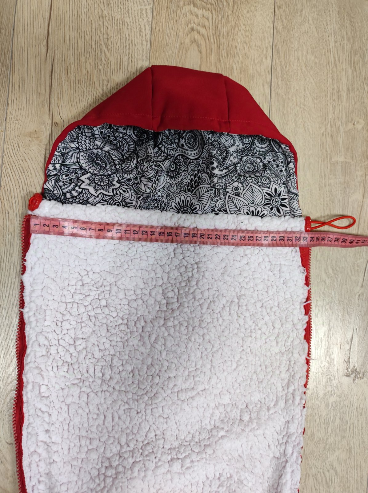 Mnou šitá vsadka do bundy na nosenie. Super teplá. Rozmery: dĺžka zipsu 52cm, dĺžka vsadky 56cm, šírka hore 45cm a dole stiahnutá na 19cm. Cena bez pošty