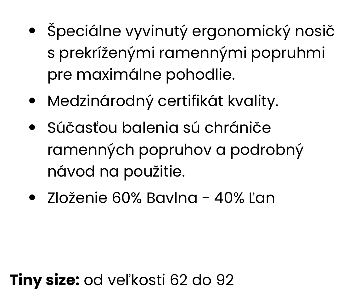 Špeciálne vyvinutý ergonomický nosič s prekríženými ramennými popruhmi pre maximálne pohodlie. Kupovaný novy, používaný pri jednom dieťati. Dvakrát prany.