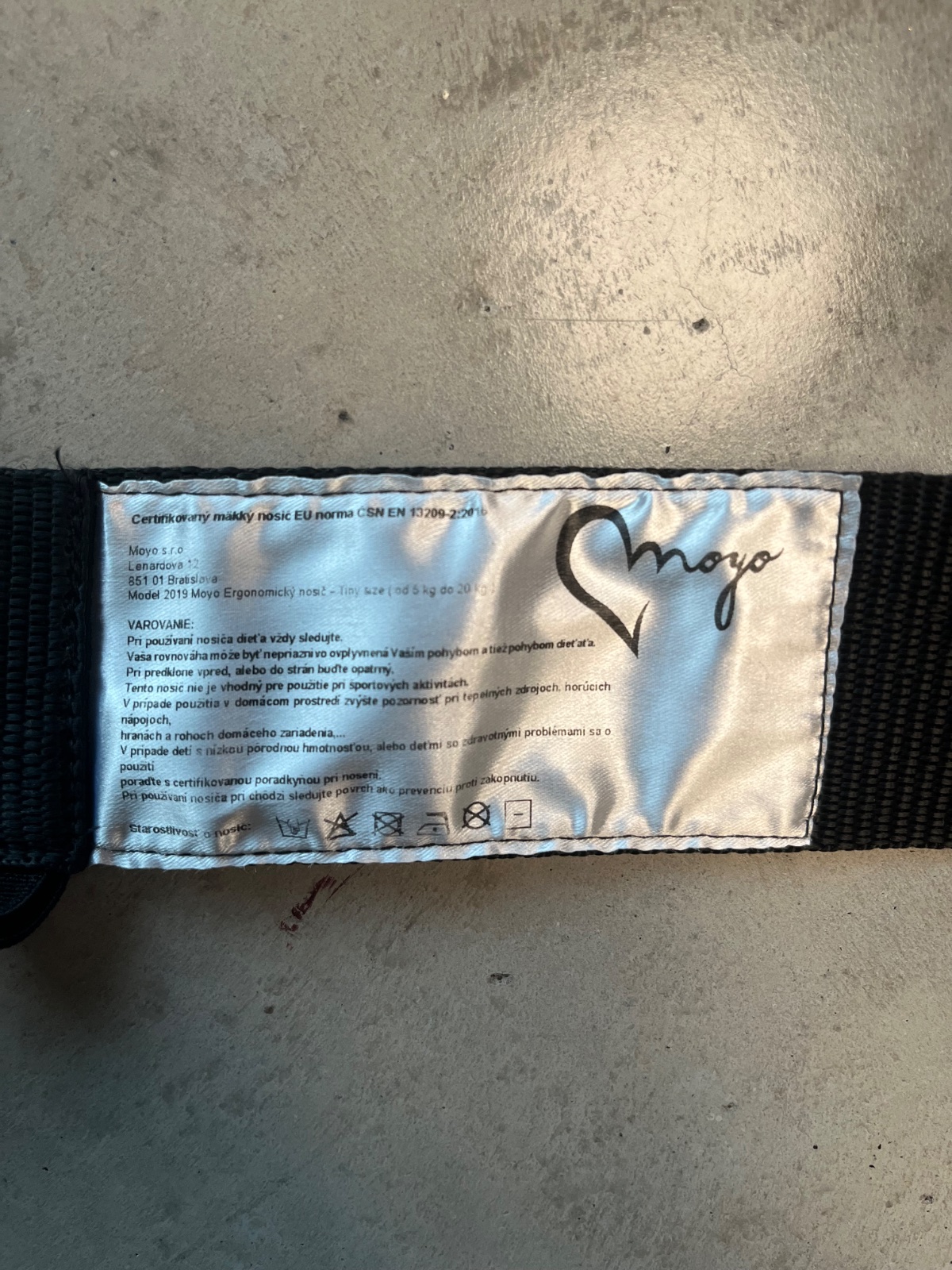 Ergonomický nosič značky Moyo, zanosený, čierny pásový popruh jemne vyblednutý. Praný v Denkmit bez parfumov,nefajčiarska domácnosť bez zvieratiek.
