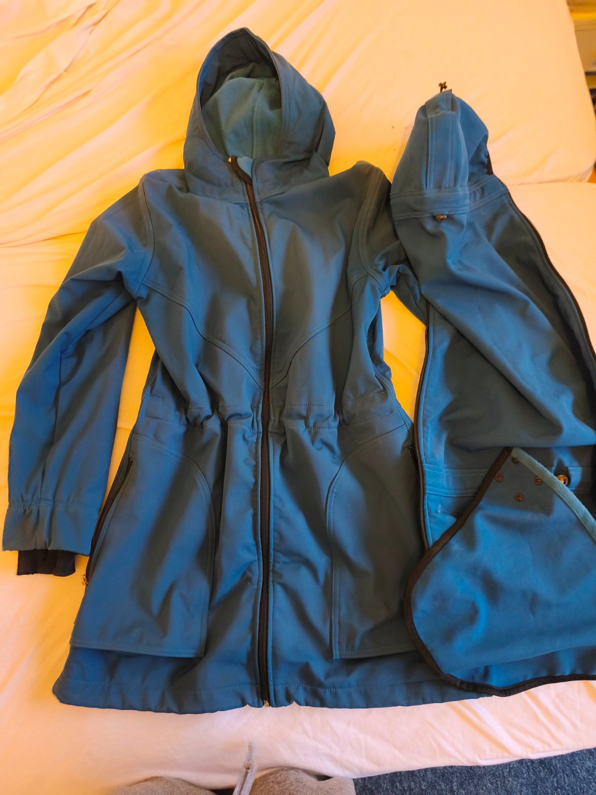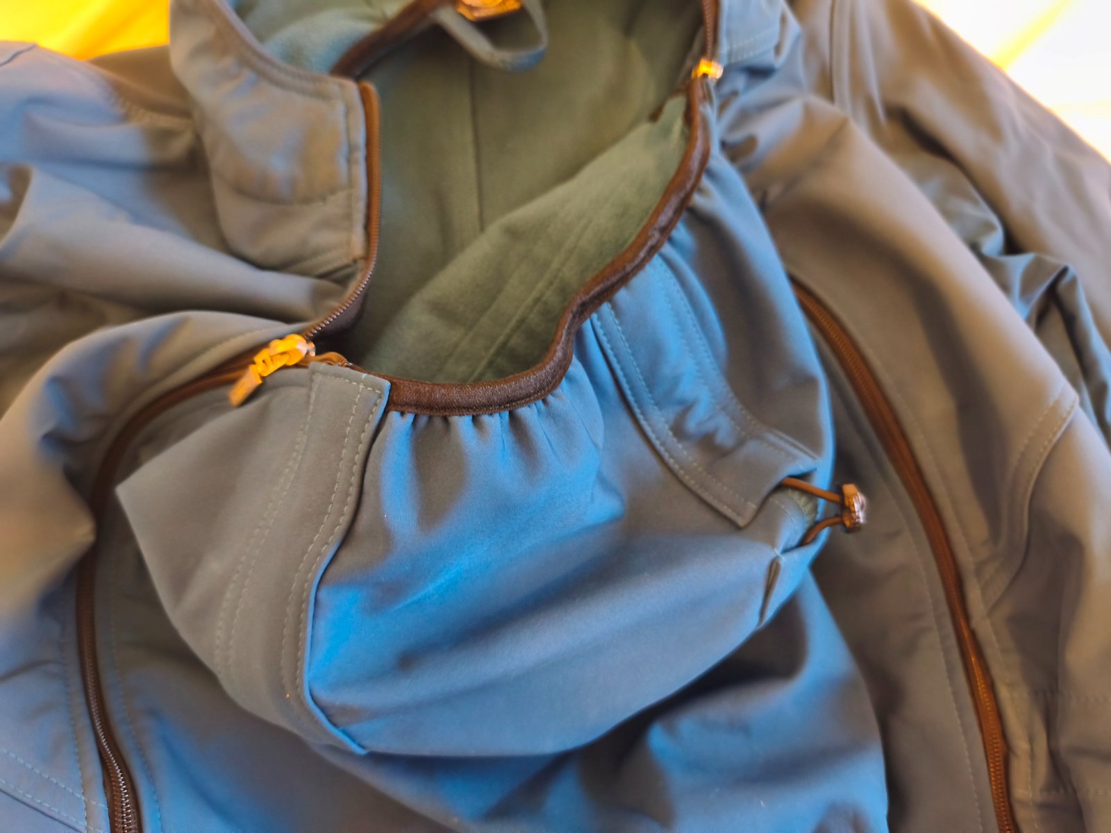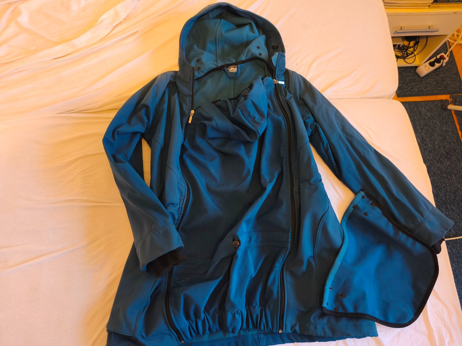 Dĺžka od pleca nadol 79 cm. Má vsadku na nosenie dieťaťa, ktorá sa dá odzipsovať a kabát sa dá nosiť aj bez nej. Plus má softshellový nákrčník pre matku.