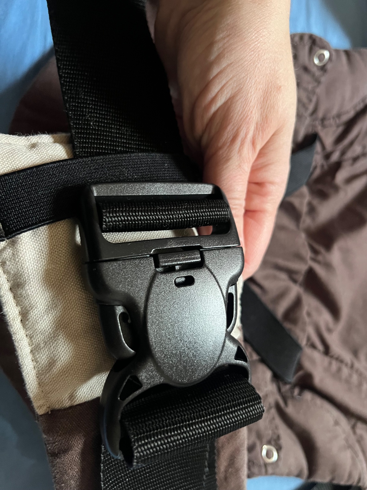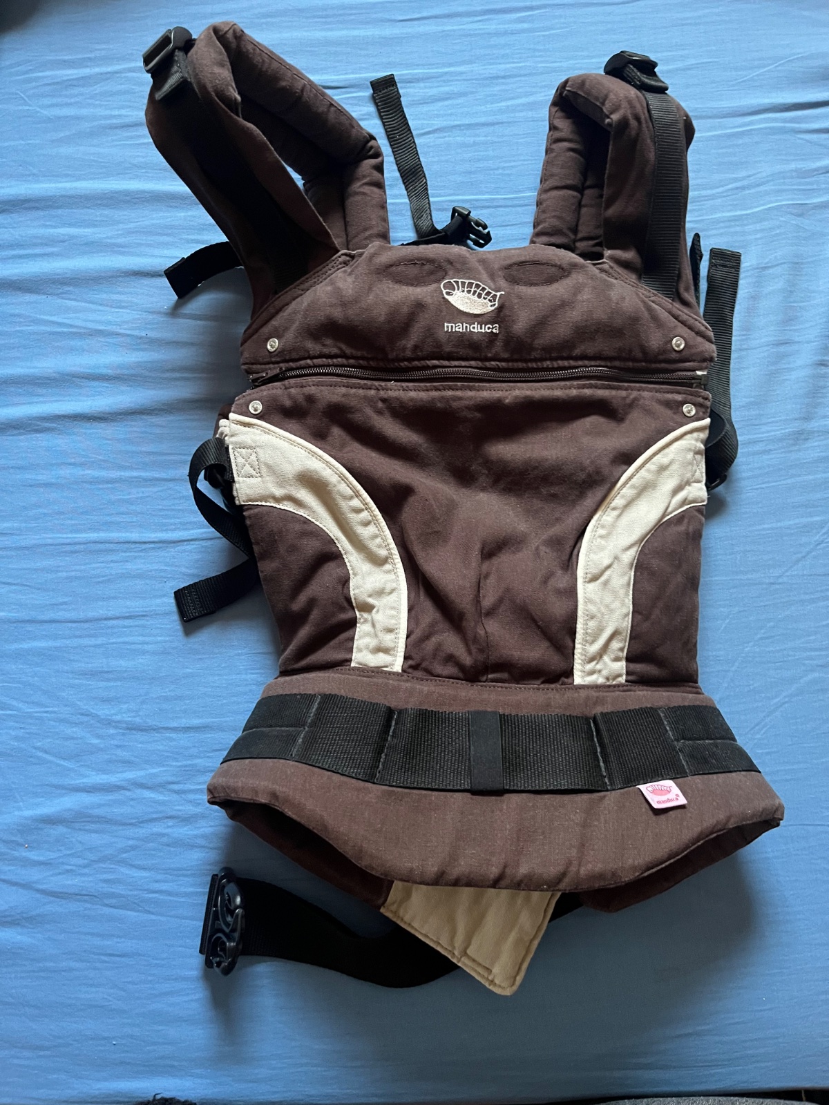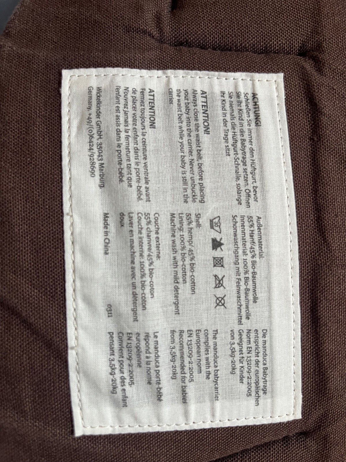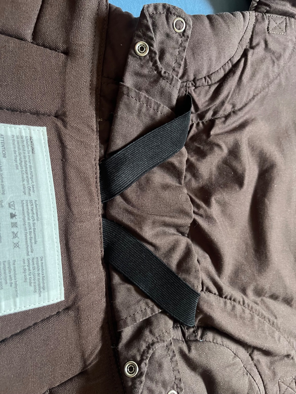 Nosič manduca je krásnej tmavohnedej farby. Farba nie je vyblednuta. Prany asi dvakrát v detskom pracom prášku.