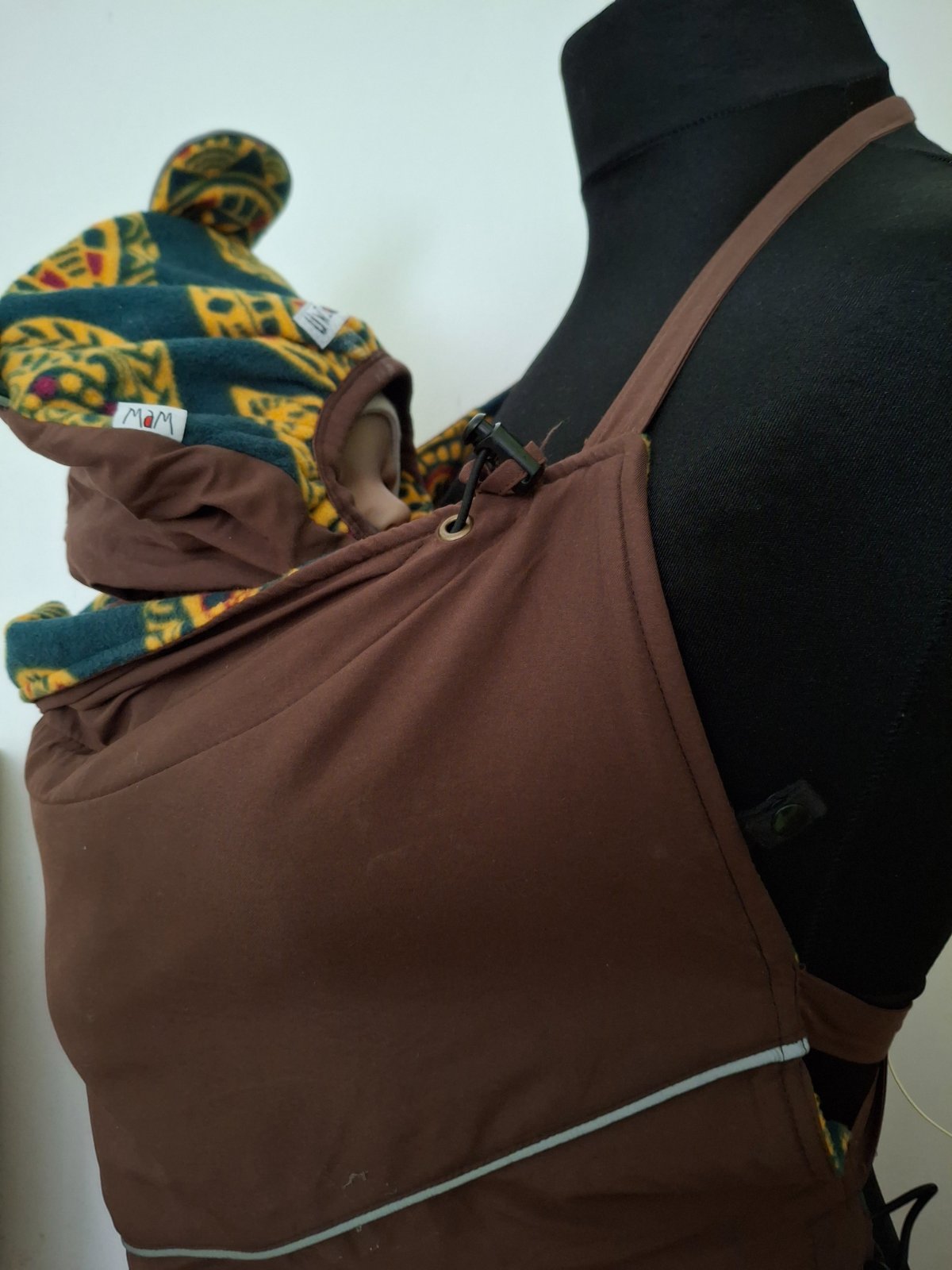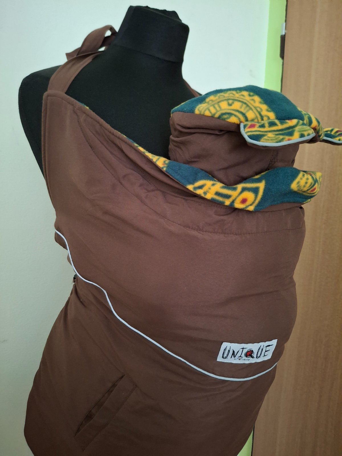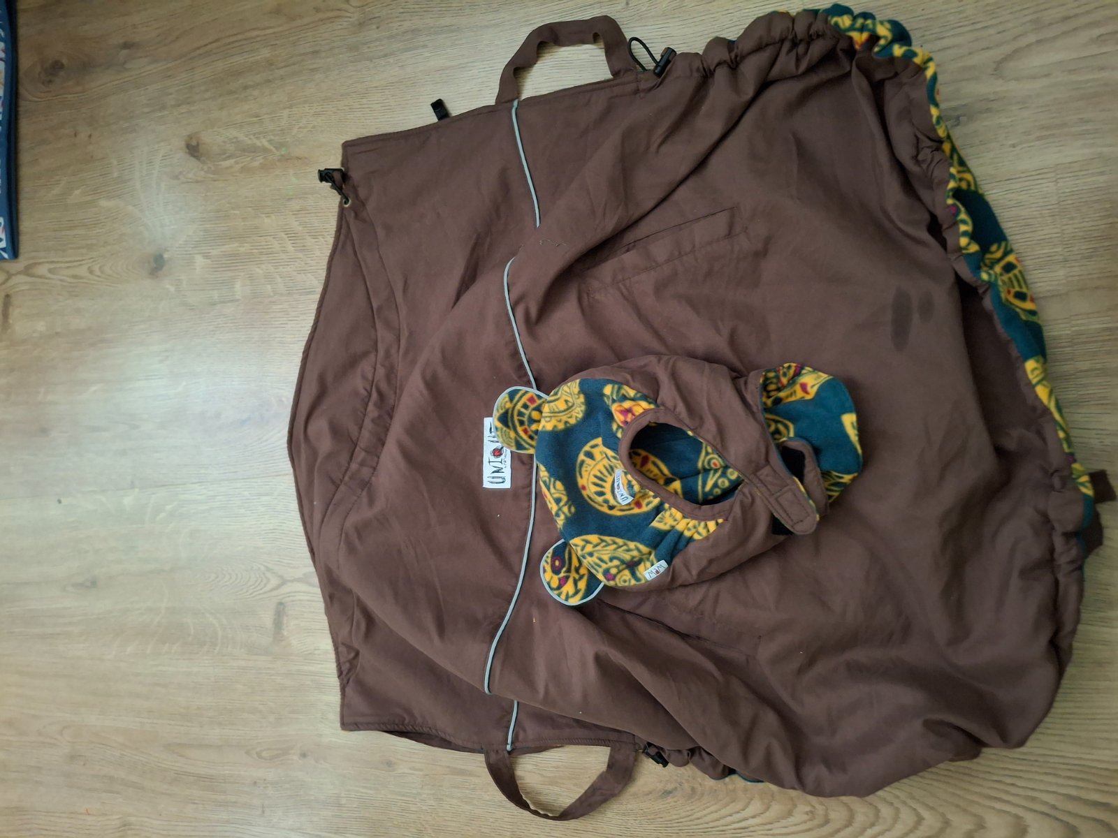 Vrecko na nosenie dieťaťa v šatke alebo v manduce, je zateplené fleecom, čokoládovo hnedá, z vnútornej zelená s etno vzorom, z oboch strán vrecká na ruky, pripínacia ochranná čiapočka s uškami, pekná a bez vady