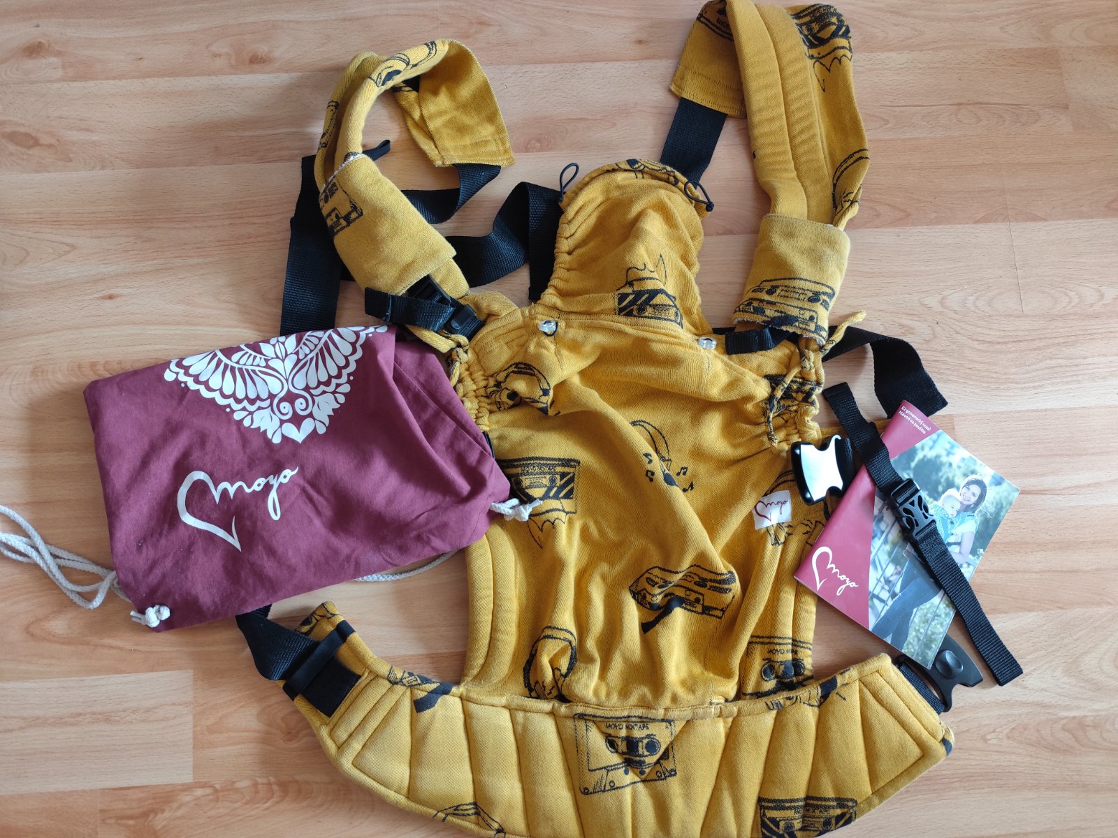 Nosič Moyo cross tiny size, od veľkosti 62 do cca 86 (1,5-2 roky), krížené popruhy, ale mám k nemu aj sponu na klasické nosenie (my sme využívali iba krížené nosenie). Je k nemu aj plátená taška a slintáky. Praný v netoxickom prášku bez aviváže, nevyblednutý, všetko v dobrom stave okrem jednej vady (na zapínaní pod pazuchou je z vnútornej strany pustená šatkovina, nám to nevadilo v nosení, nezväčšovalo sa to, nafotila som). Nefajčiarska domácnosť bez zvierat.