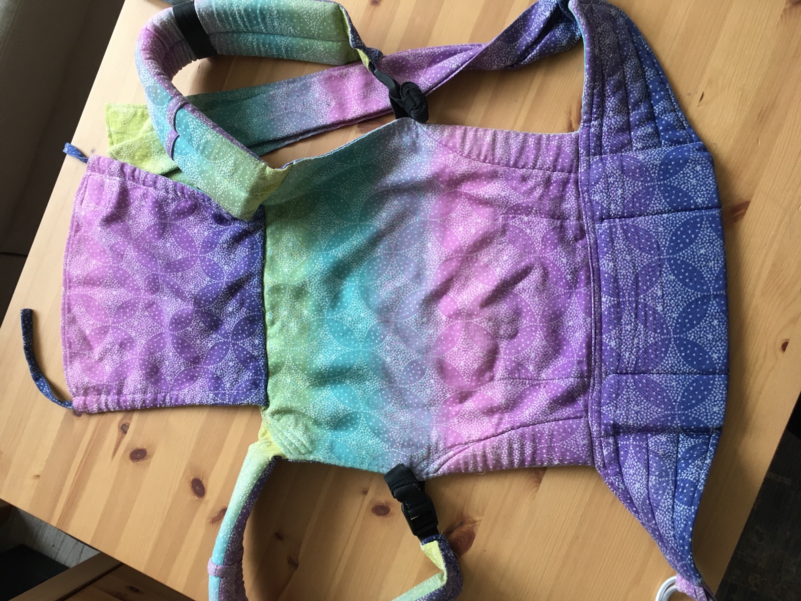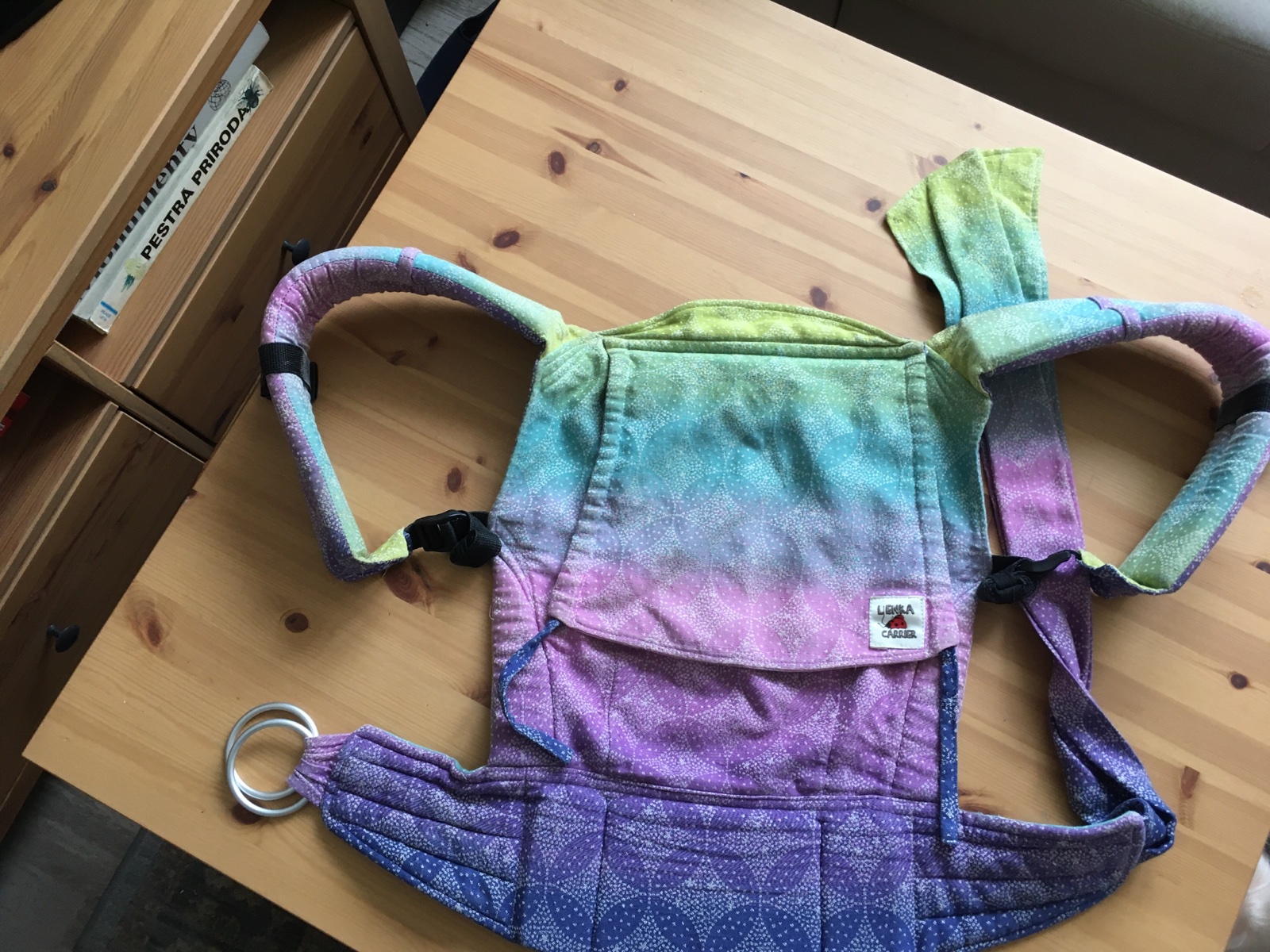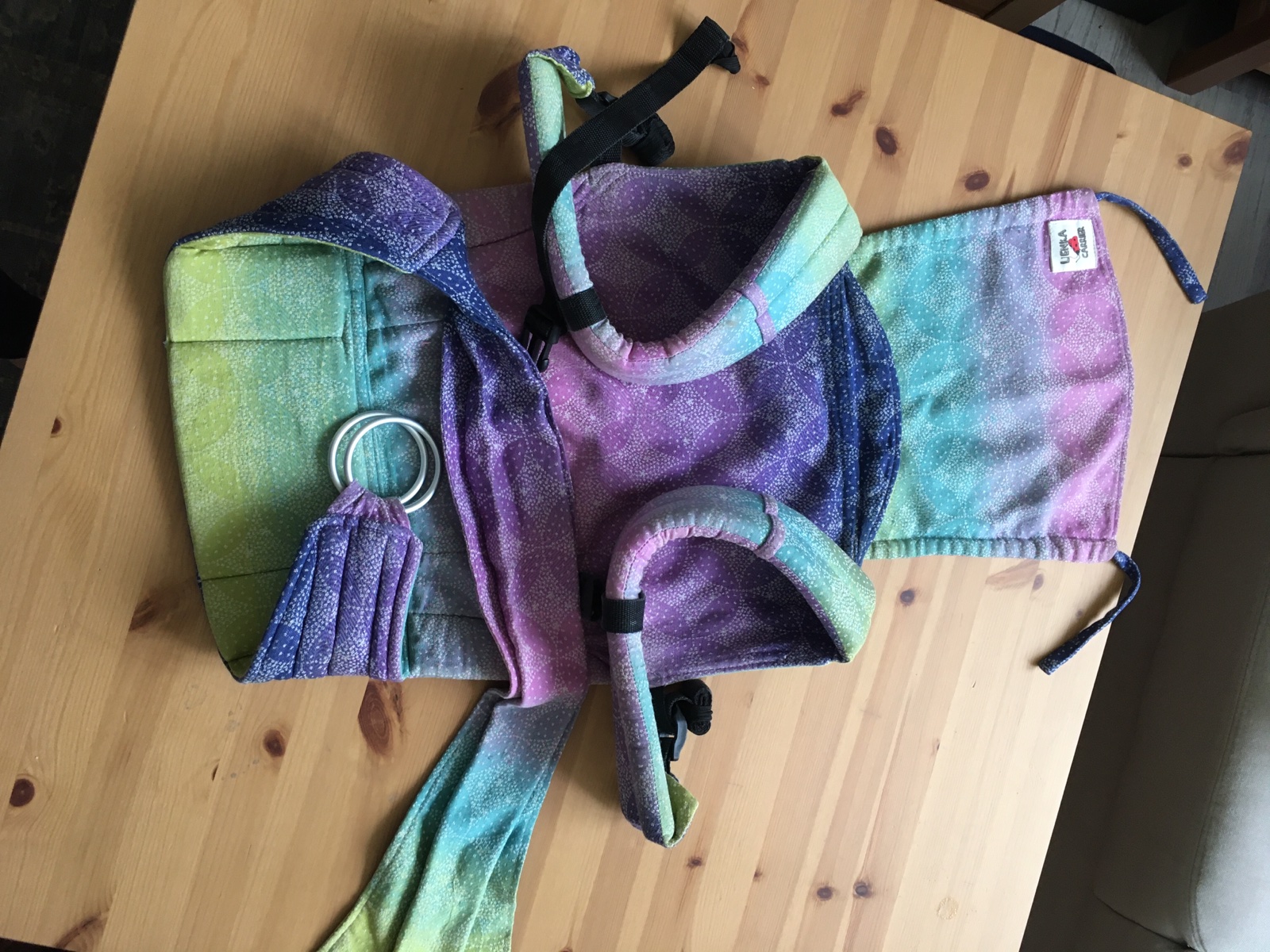 Celosatkovy (oscha) nosic. Velkost toddler (18-24 mes). Nerastuci. Da sa nosit z oboch stran. Bedrak na ring sling kruzok - pre mna velmi pohodlne. Krasne farby. Kupovala som ho za 200e.