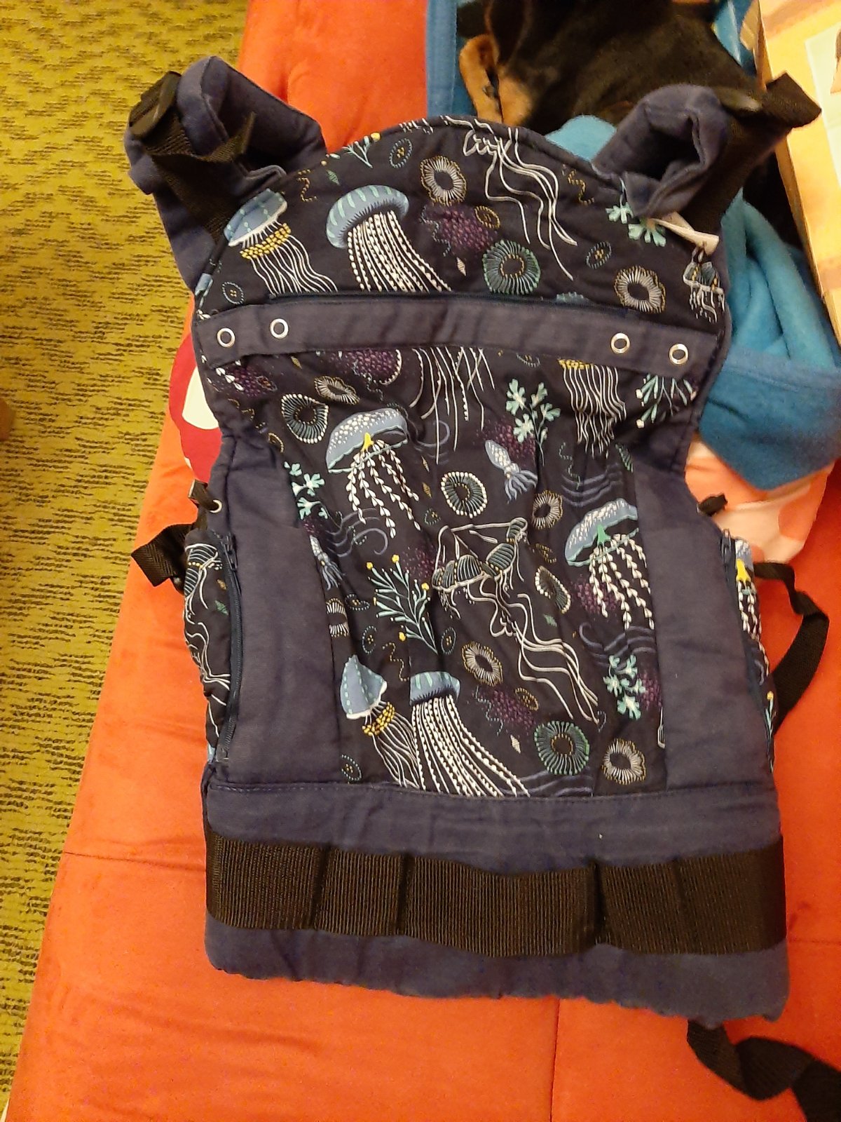 Používaný, bez poškodení. Farba trochu vyblednuta. Nosic je so vsadkou pre novorodenca, pridám capacky z rovnakej kolekcie aj slintaky proti olizovaniu popruhov.