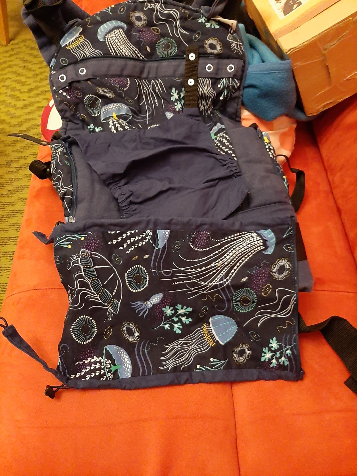 Nosič po troch deťoch, používaný však malo, len sem tam na prechádzku, farba je vyblednuta, inak nemá žiadne poškodenia. Možnosť nosiť v predu, na chrbte a na boku