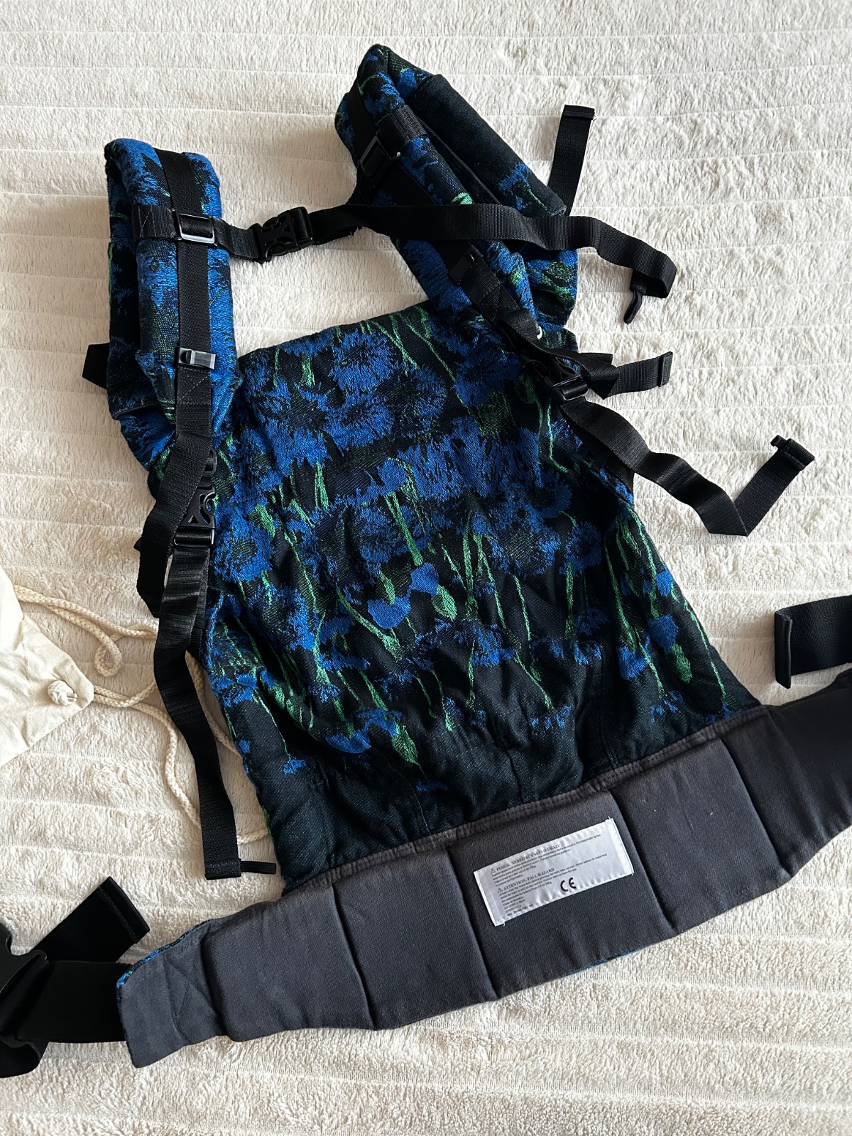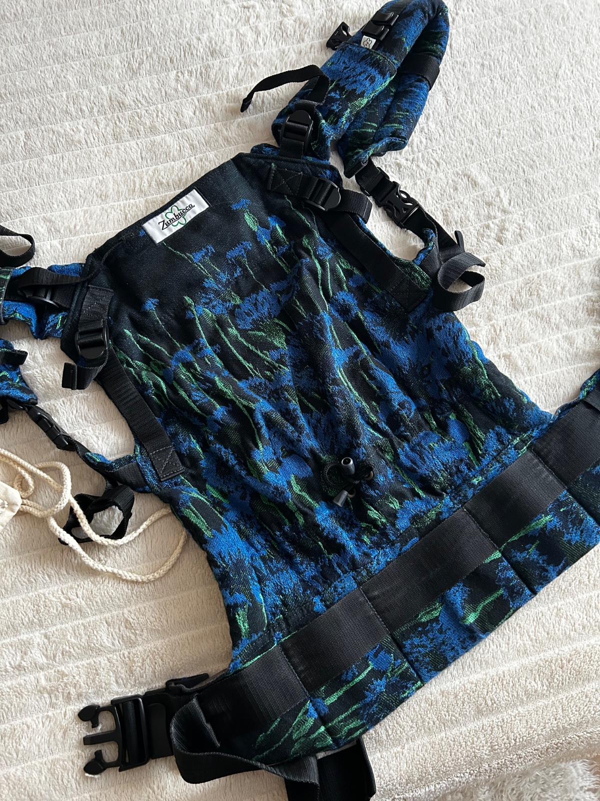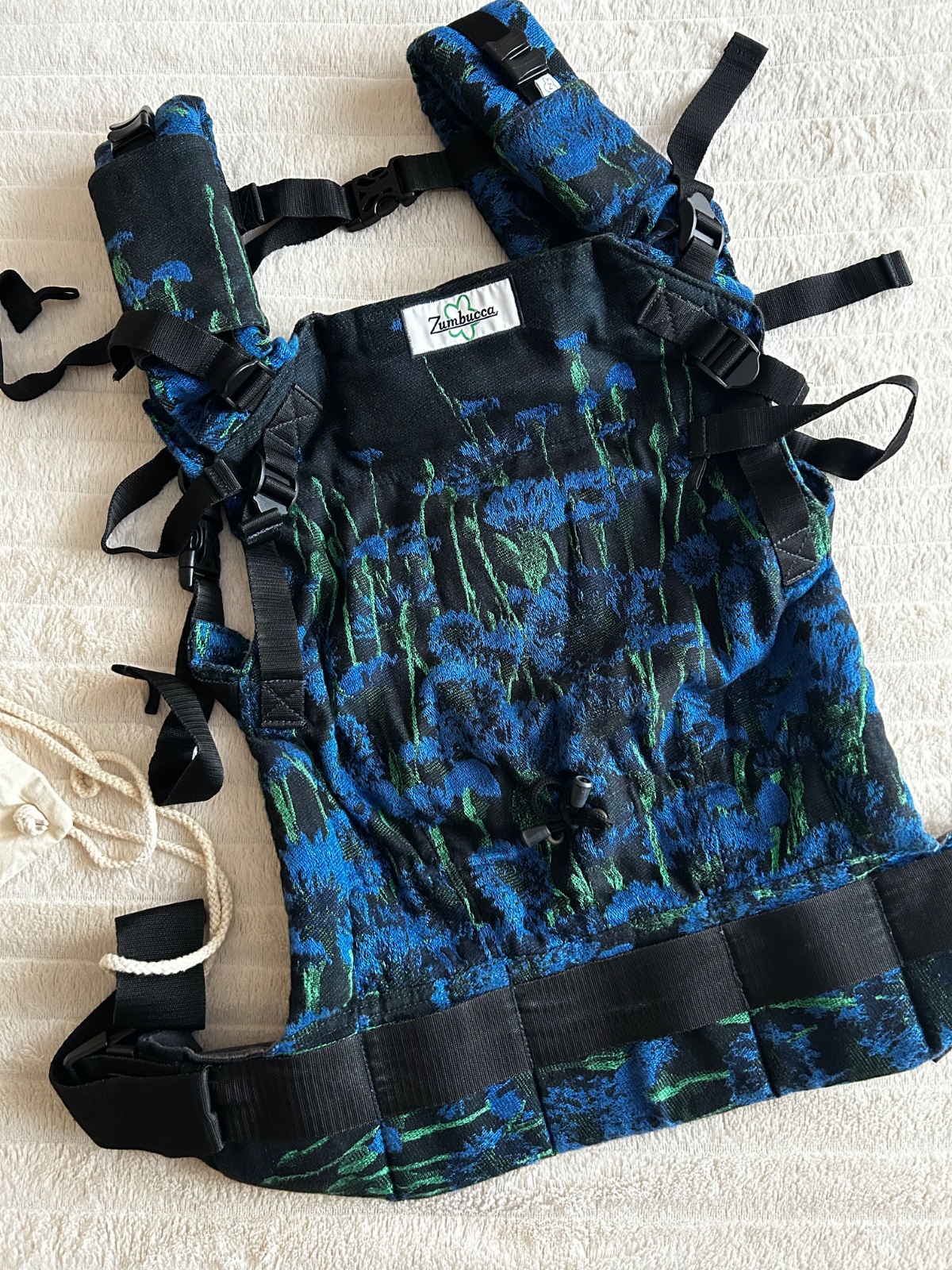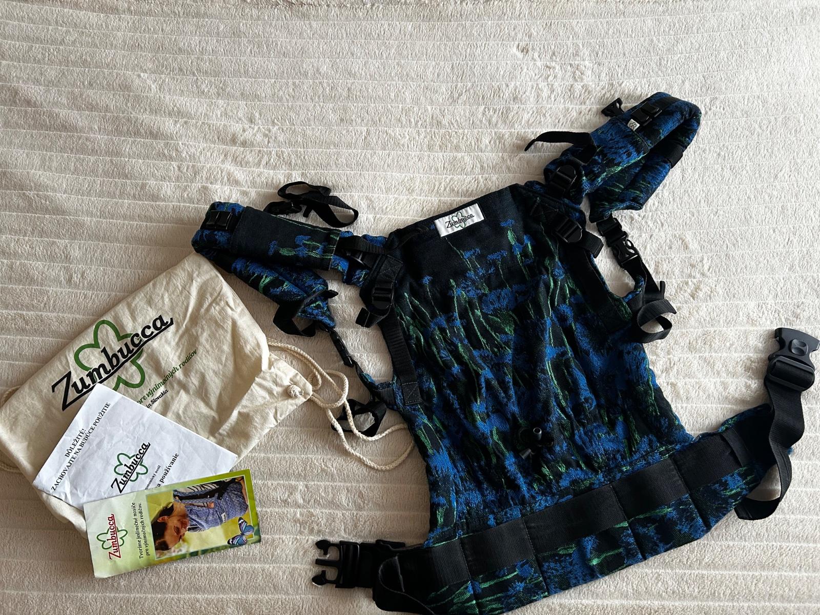 NÁZOV NOSIČA/VÝROBCU: Zumbucca zo šatky PELLICANO BABY cornflowers lillevert (30% ľan, 70% bavlna) myslím, že jediný v tejto farebnej kombinácii. Súčasťou sú slintaciky, kapucňa a taška. Retail cena 200€.